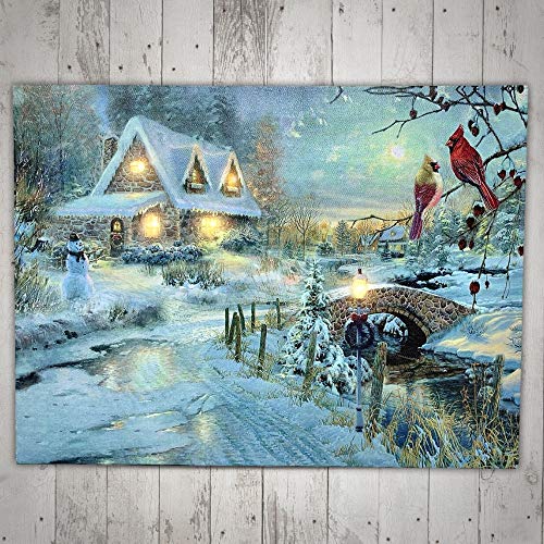 LED Village Cottage Along a Stream Christmas Scene with Cardinals and Snowman Canvas Wall Art Decor
