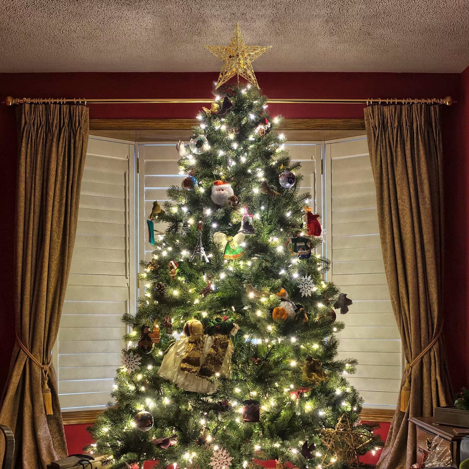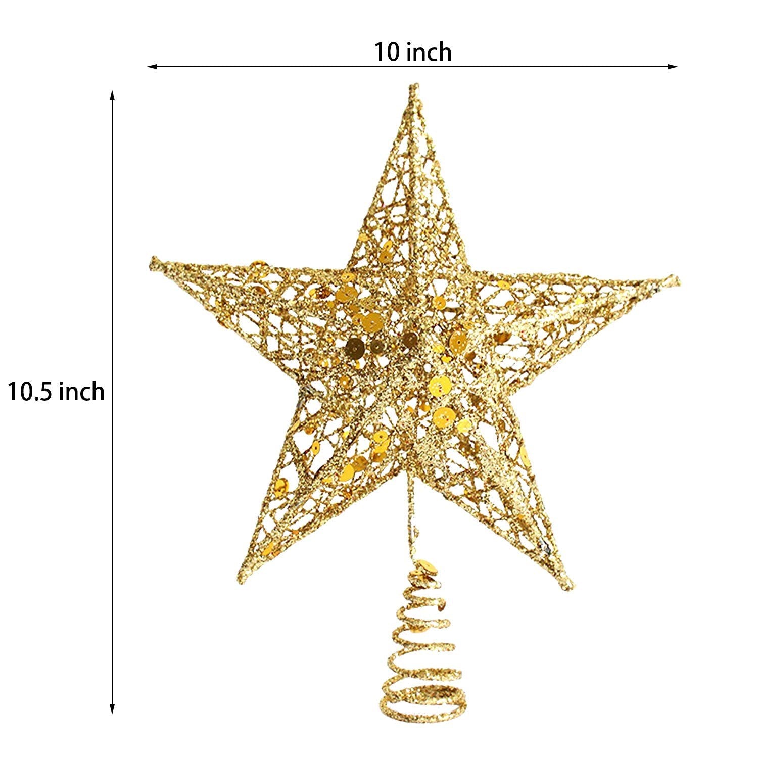 CHRISTMAS TREE TOPPER DECORATION - Star decor shape, very vintage and traditional. Bring a rich warm glow to your Christmas tree. A Brilliant shinning with the gold glitters that is sure to add sparkle to your holiday decor. PERFECT SIZE. Won't fall easily, give you best mood for Christmas day. These unique top star part is 10 inches. Easily to fit with most sizes of Christmas tree. DURABLE SPRING SUPPORT & METAL MADE. Very sturdy, the whole set is eco metal made, more stable and durable. Just fix it on the top or the side of tree, then plug into the socket, easy to install. ADDS CHRISTMAS ATMOSPHERE. Get some special favors with this gold hollow tree topper.This Star Treetop is the perfect way to complete the decoration of your Christmas tree. Nobody could miss the star decoration on the top of the Christmas day. DIY XMAS TREE TOPPERS. Thanks to the hollow design that you can combine use it with LED lights or string lights for better effect. DIY your own special tree topper now! *- Coolmade Christmas tree topper is drenched in dazzling silver and gold glitter. Add some sparkle to your Christmas tree with this star-shaped tree topper. *- -Easy to Operate & User Friendly -Unique Style Lighted Christmas Tree Star Topper - Color: Gold - Material: Metal. - Size: 10 inch. -Compact & Classic for Holiday Decoration - Star decor shape, very vintage and traditional, to share the around with sheers of the festival. It's elegant with a touch of sparkle, not gaudy.