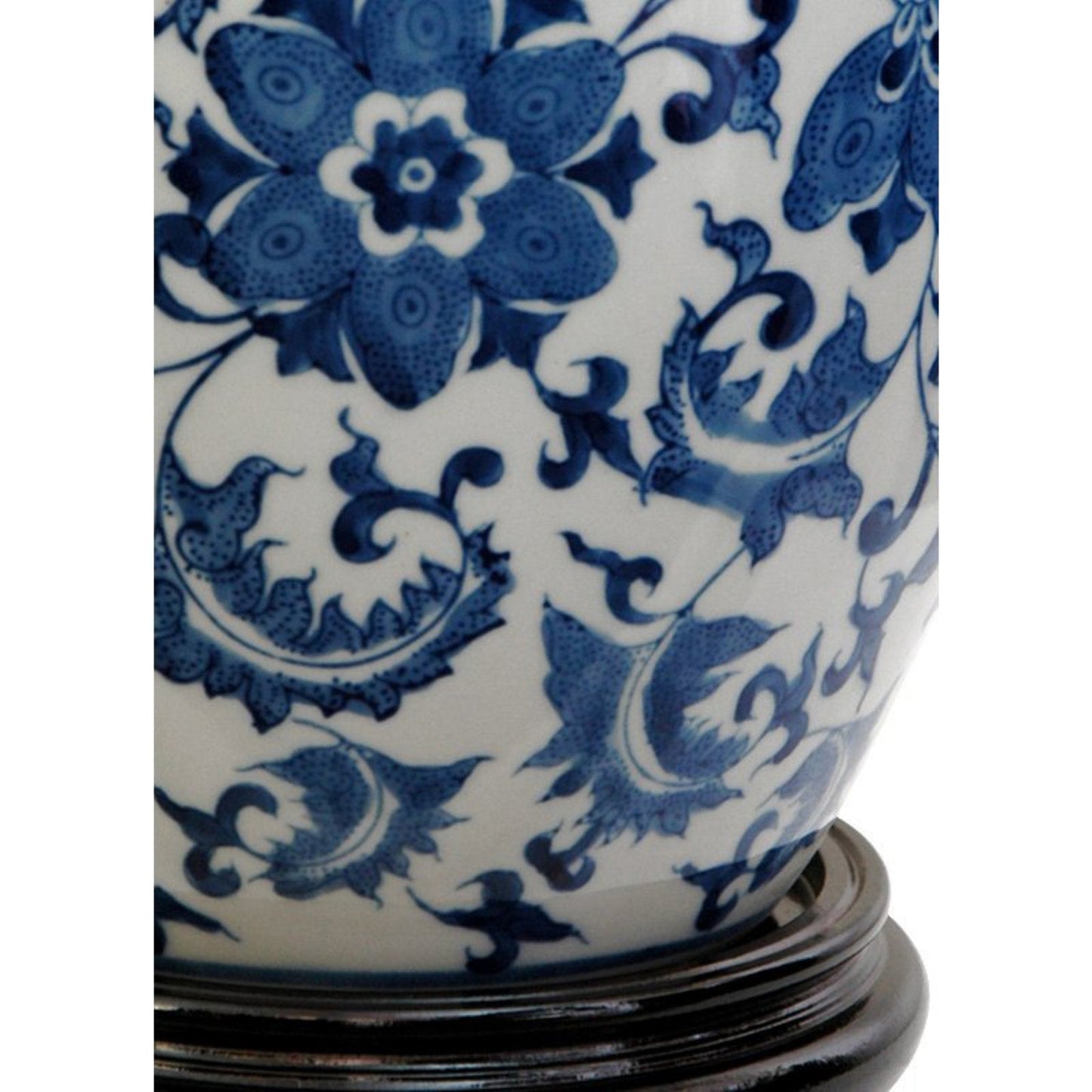 Imported oriental spice jar in a classic melon shape, with royal blue Ming floral pattern on a white china background. Finished with an antiqued ice crackle over glaze. Display in matched pairs on a breakfront, sofa table, or credenza, or individually on a Rosewood plant stand, decorative base, or lacquered pedestal. 11" Floral Blue and White Porcelain Vase Jar: *- High grade Asian vitreous porcelain *- Classic blue and white vine and flower design *- Accents traditional or modern interior design *- Color: blue and white *- Material: porcelain