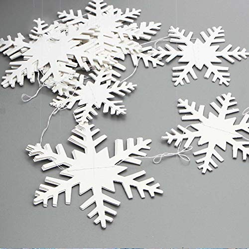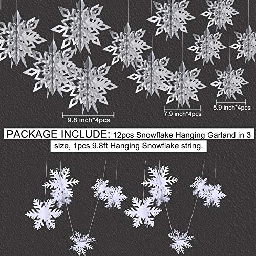 - ❄️Suitable Size: Large silver snowflake has three sizes 9.8'' / 7.8'/5.9'', 4pcs of each size. The snowflake garland is 9.8 feet long with 12pcs snowflake in three size 4.7“/3.9"/3"