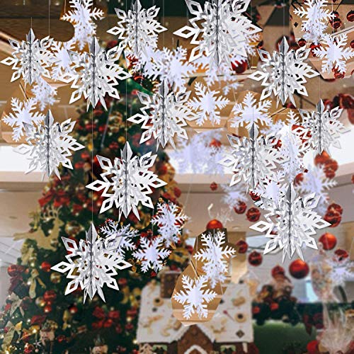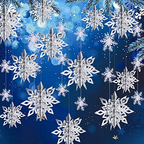 - ❄️Valuable Pack: 12pcs 3D Glittery Large Silver Hanging Snowflake & 12 pieces 3D snowflakes in one string. Just fold along the sewing seam to get 3D snowflakes!