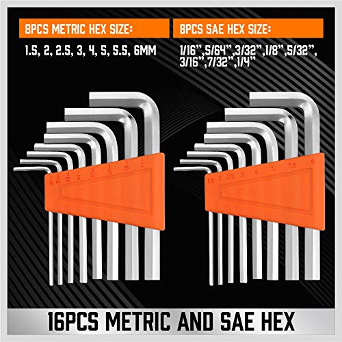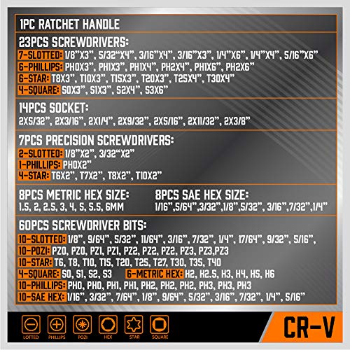 - 122 pieces ALL-IN-ONE ▲23pc Screwdrivers, ▲60pc Bits Set, ▲7pc Precision Screwdrivers, ▲14pc Socket, ▲16pc Metric and SAE Hex Key & ▲1Pc Ratchet Handle with ▲Durable Plastic Stand.