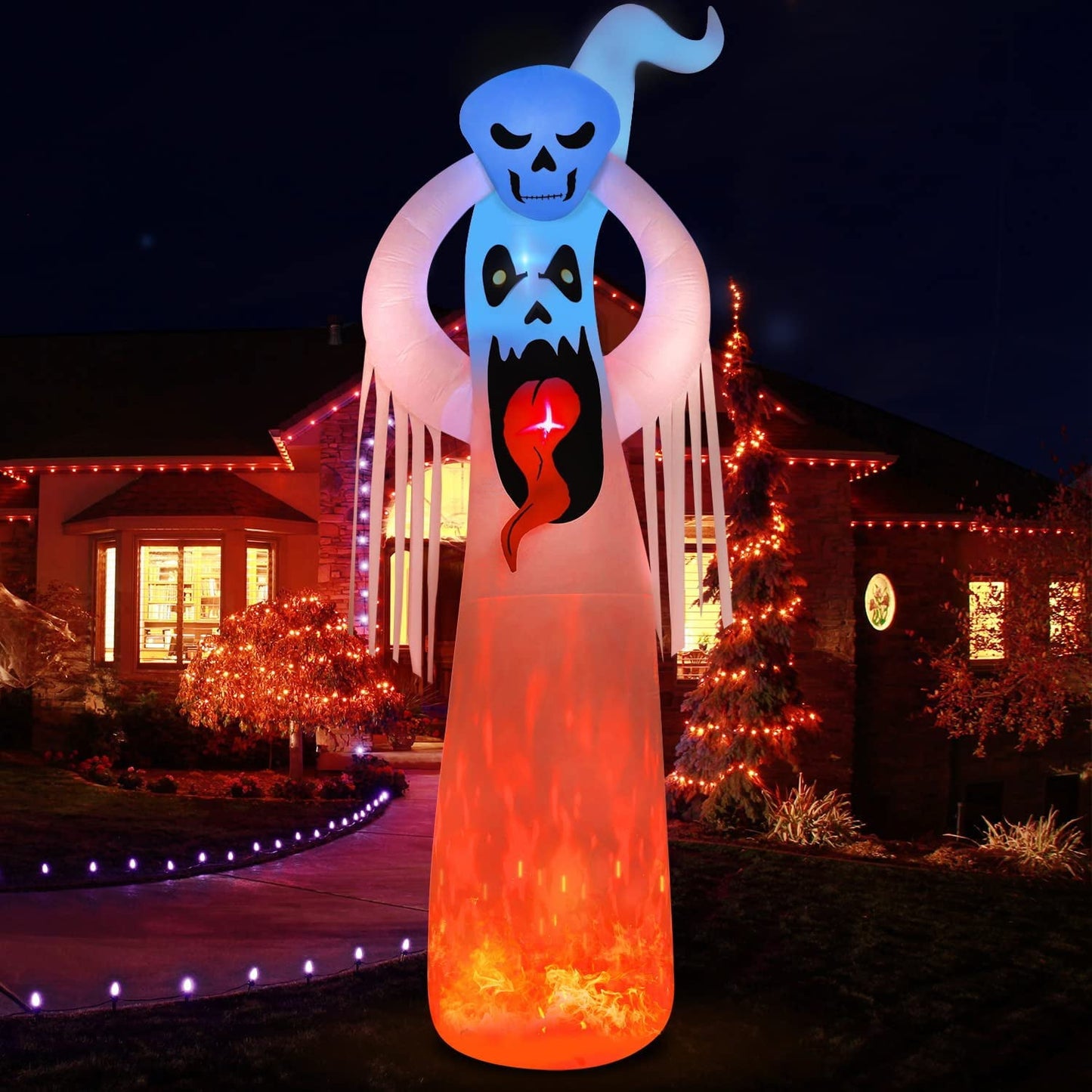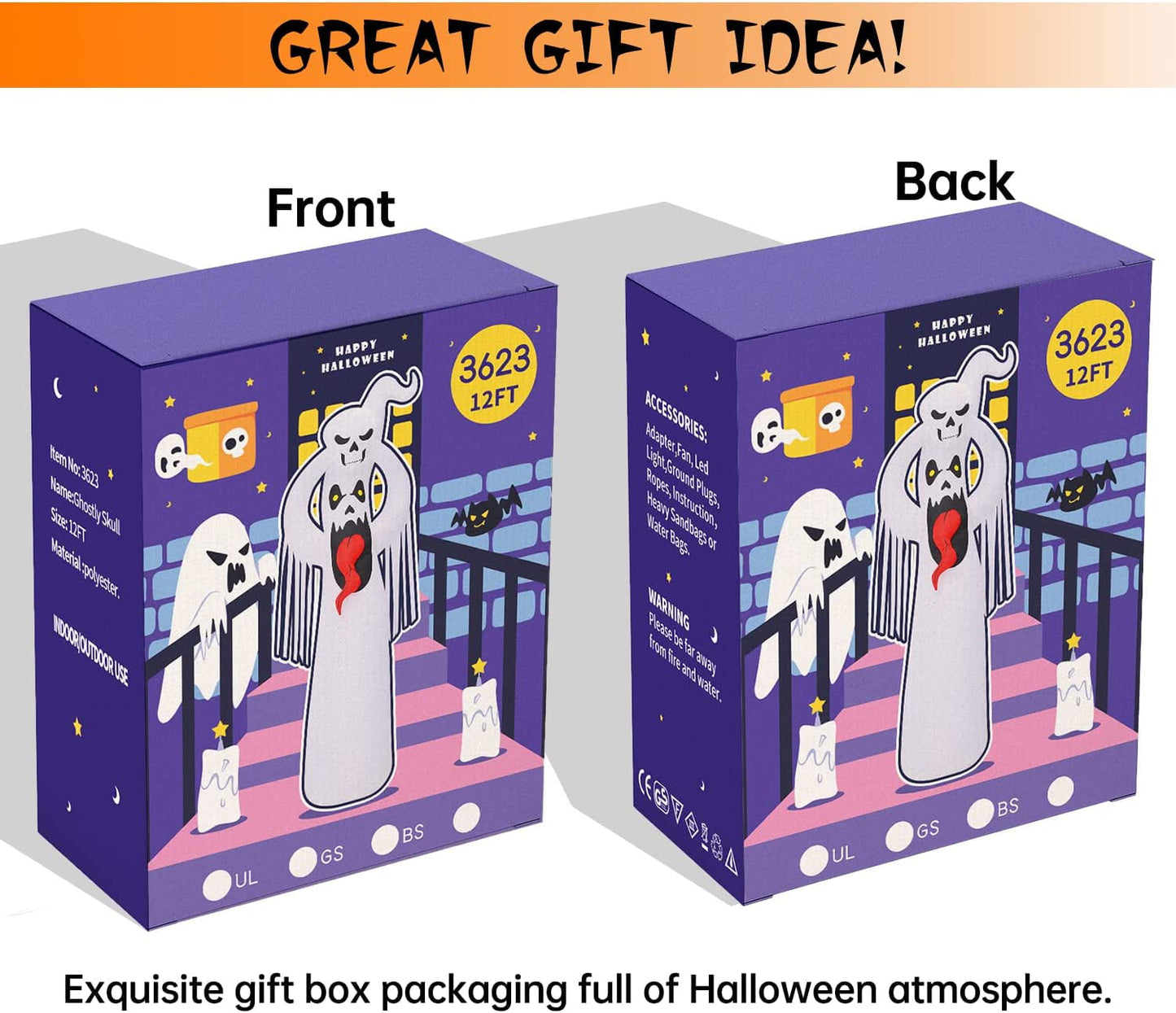 DRESS UP YOUR HALLOWEEN PARTY! EASY TO INSTALL & ANCHORS SECURELY Using high-quality materials, three-dimensional cutting through the image of lovely and vivid, It is the perfect Halloween party decoration. You can put them in the outdoor, yard, garden to create a Halloween atmosphere. It will attract the attention of everyone who sees it, especially children will be fascinated by it. Color: as shown in the figure Material: 190THigh-quality waterproof material Size: 12 FT Built-in LED lights Perfect Halloween Decorations *- You can place it in gardens, yards or parties. Always be ready to scare and delight all your neighbors and guests. Bringing a Spooky party for trick or treat people! Internal LED Light *- Eye catching LED lights to light up your home or yard in the night, The giant ghost are giving off an colorful glow, its red tongue will create a very frightening holiday atmosphere. Always be ready to scare and delight all your neighbors and guests. Firmly Fixed on the Ground *- Made of high-quality thick waterproof polyester fabric. Don't worry that this Halloween inflatable will drift in the wind or be damaged in the rain, including plastic stakes, metal stakes, Ropes, bottom, water bag, These accessories can firmly fix it on the ground. Easy to Install *- The gift box includes everything needed for quick and easy installation. Just plug in a standard socket. The bottom pocket is designed to place heavy objects so that it can stand without stakes. The lightweight material and self-inflating design make it easy for anyone in the family to set up and take down.