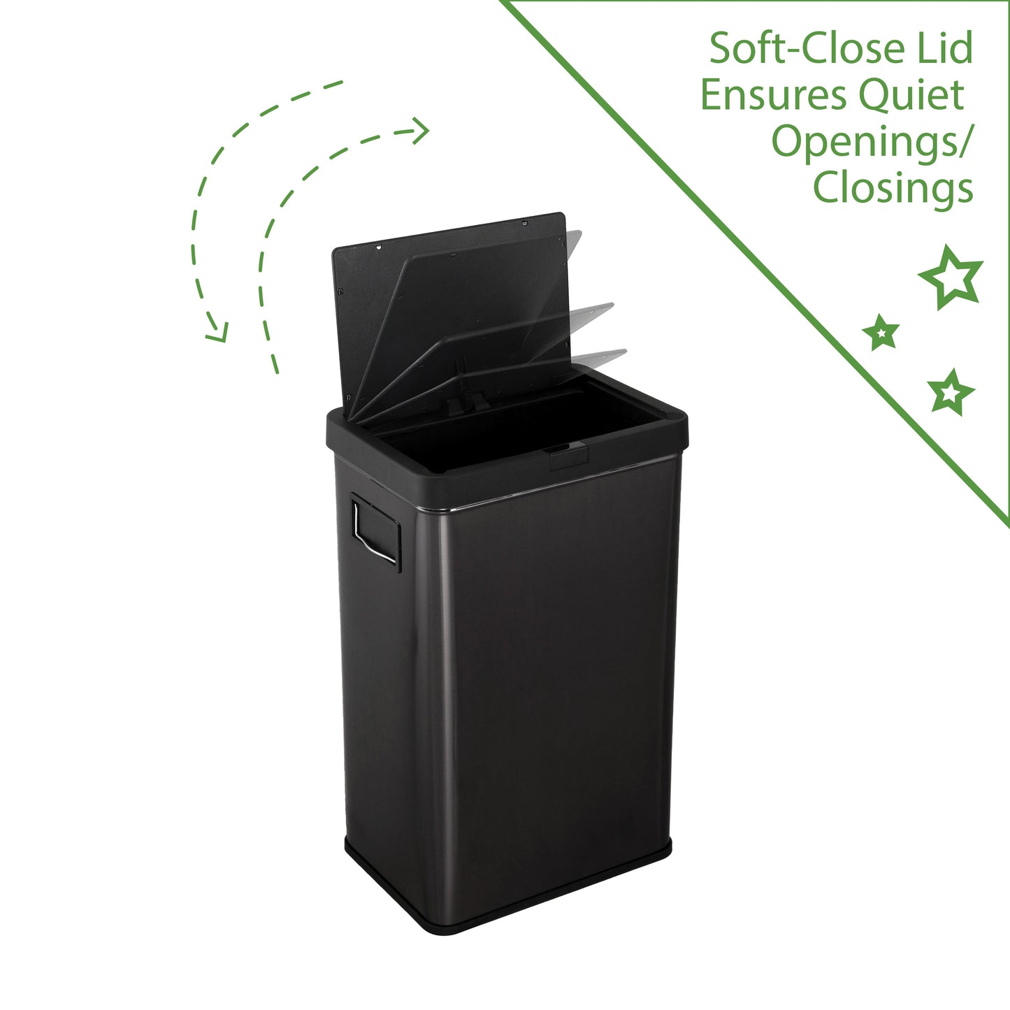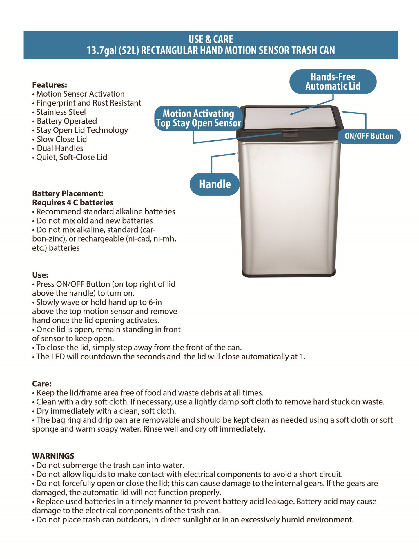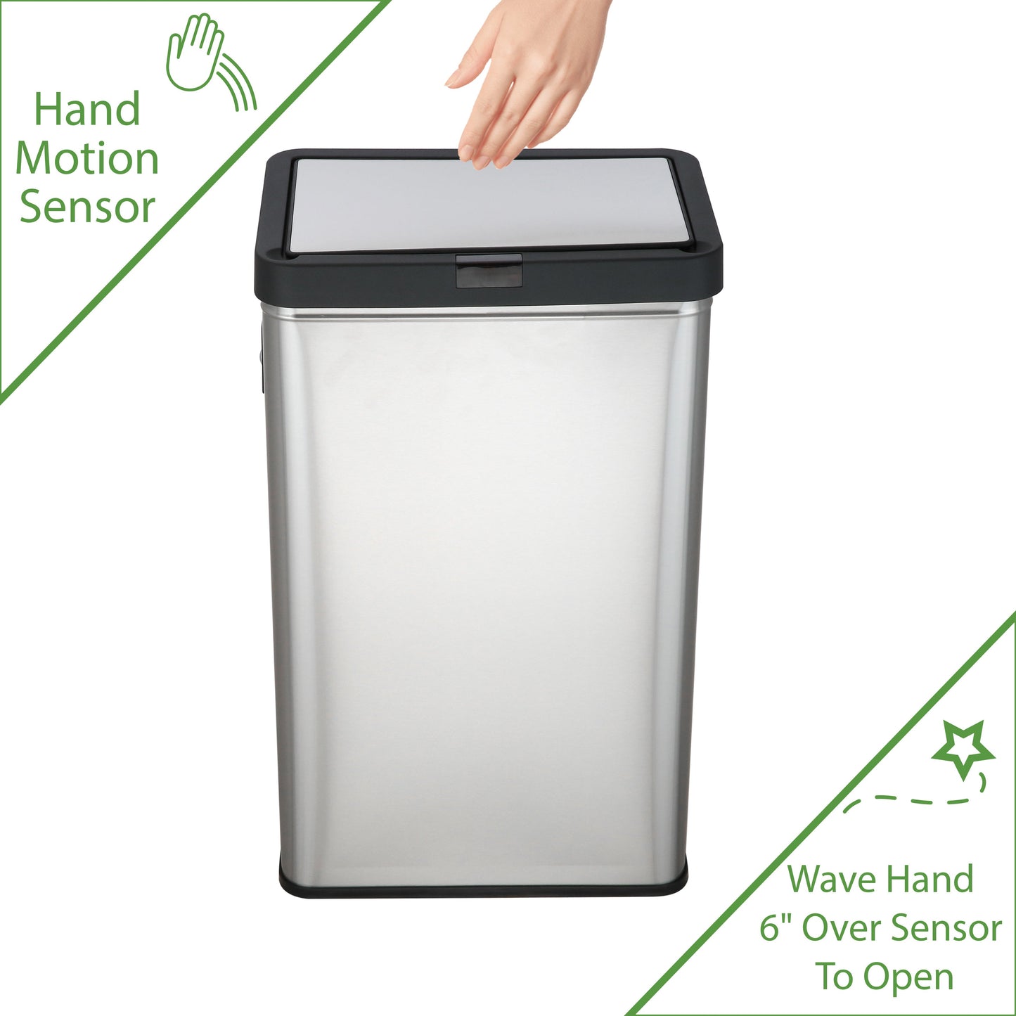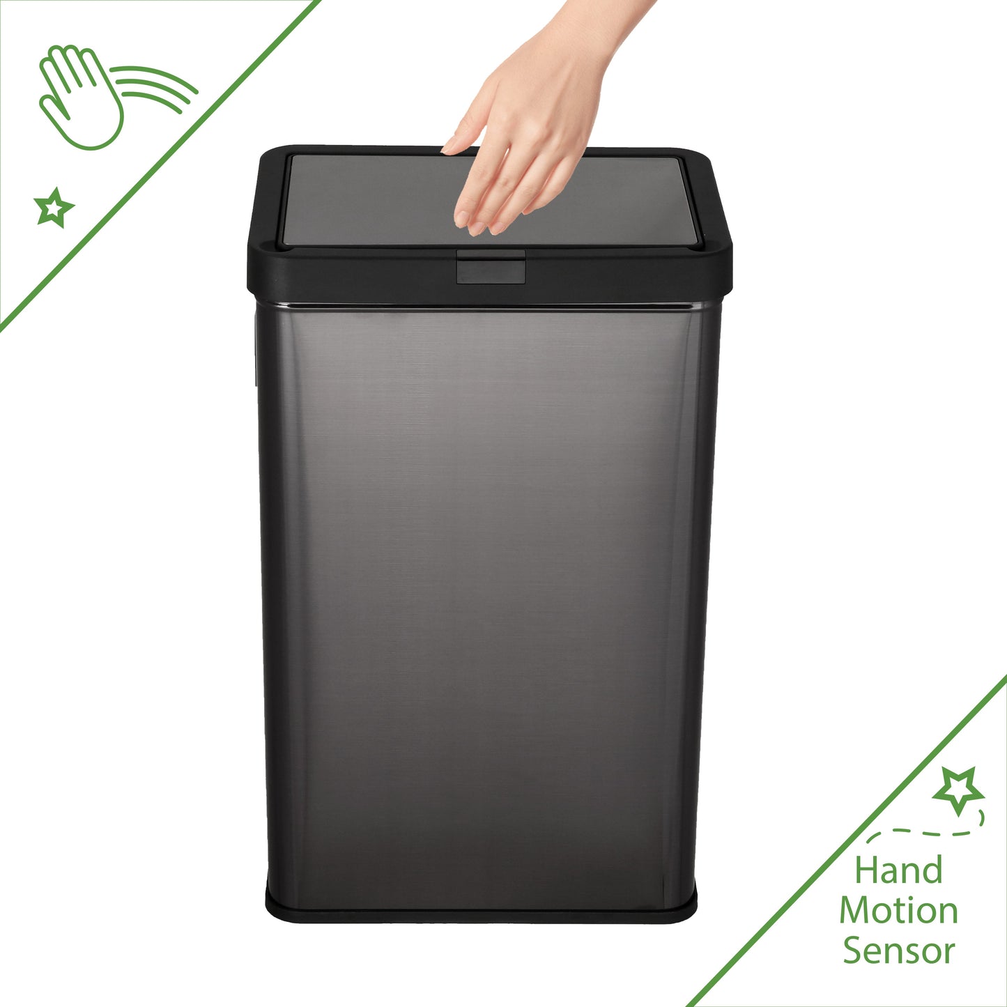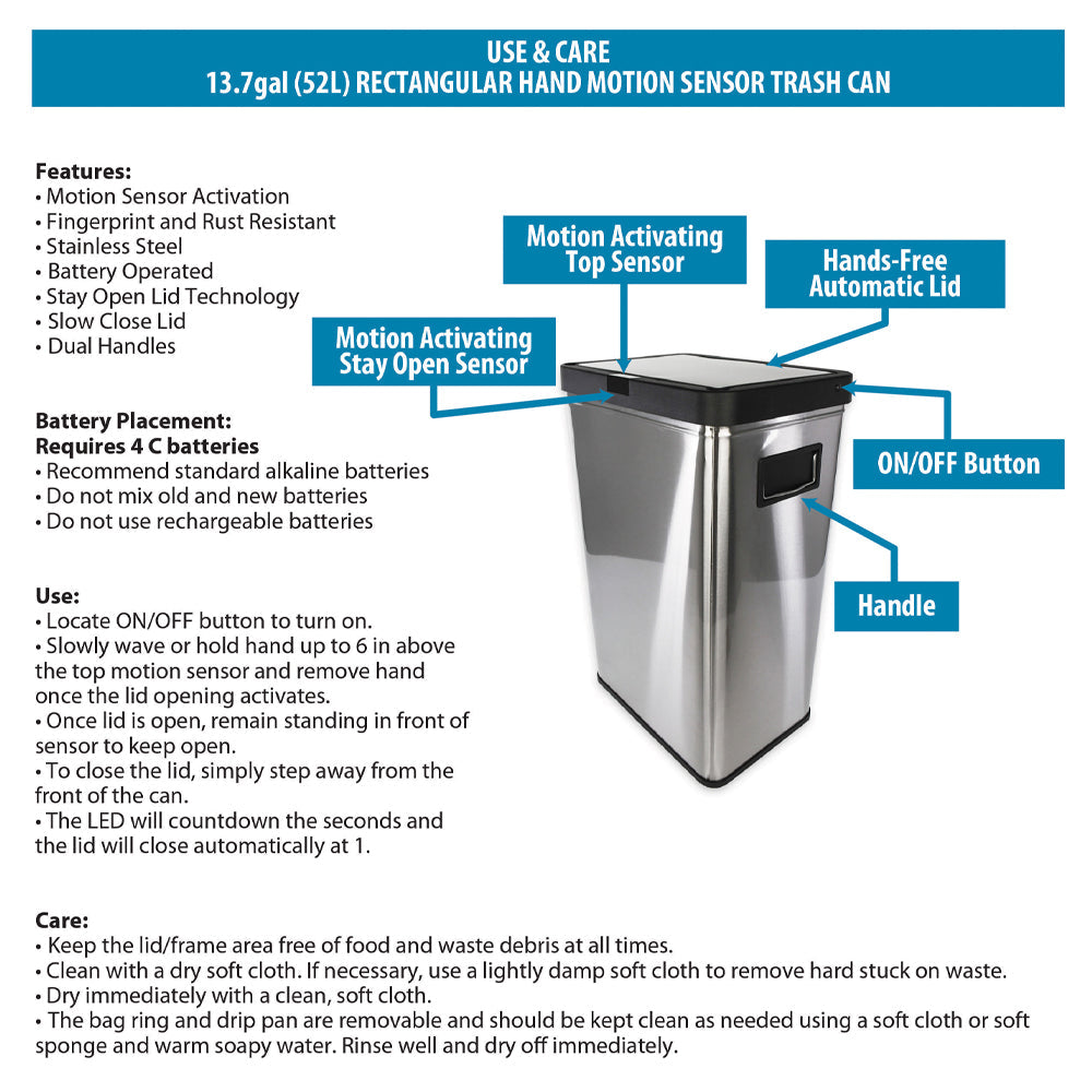 13.7 gal (52L) hand motion-activated sensor Kitchen Garbage Can, in black, adds a touch of luxury and convenience to any home. This fingerprint- and rust-resistant durable stainless-steel bin features a spacious lid opening allowing easy disposal of your waste. The convenient stay-open lid motion sensor technology employs dual sensors to pick up your presence in front of the bin and keeps the lid open until you walk away, thereby triggering the visual countdown timer to re-start before closing the lid. This technology helps prevent false lid openings. Its sleek 24.29" x 15.11" x 10.74" profile allows for a close fit against any wall or cabinet. The hand-motion activated lid provides over 15,000 opening/closing cycles per new 4 “C" battery set (providing the included Use and Care instructions are followed). Batteries not included. *- Hand Motion Sensor Open and Close 13.7 gal Kitchen Garbage Can. *- 15,000 lid openings per battery set. *- Easy-to-Clean Drip Tray *- Space Saving Slim Profile Design (24.29" x 15.11" x 10.74"). *- Fingerprint Resistant Stainless Steel