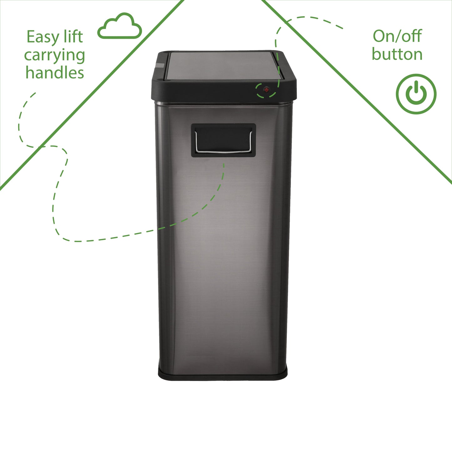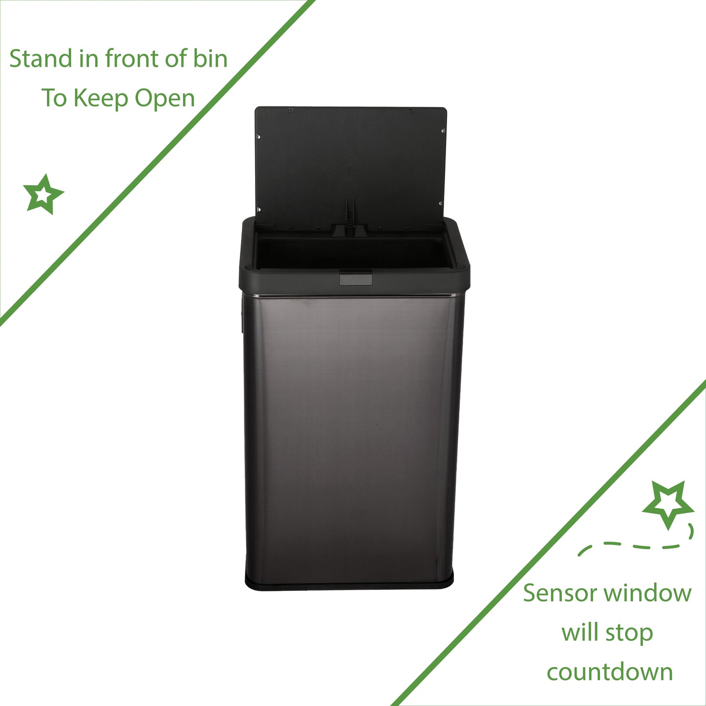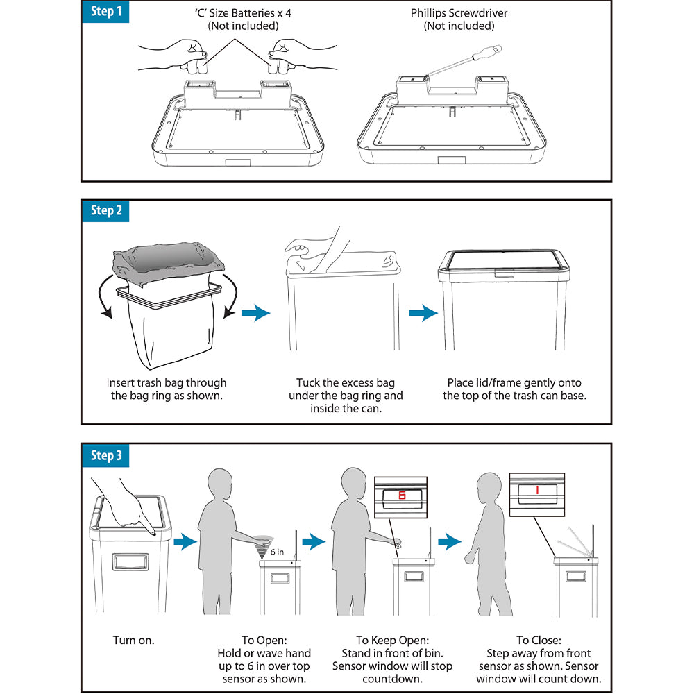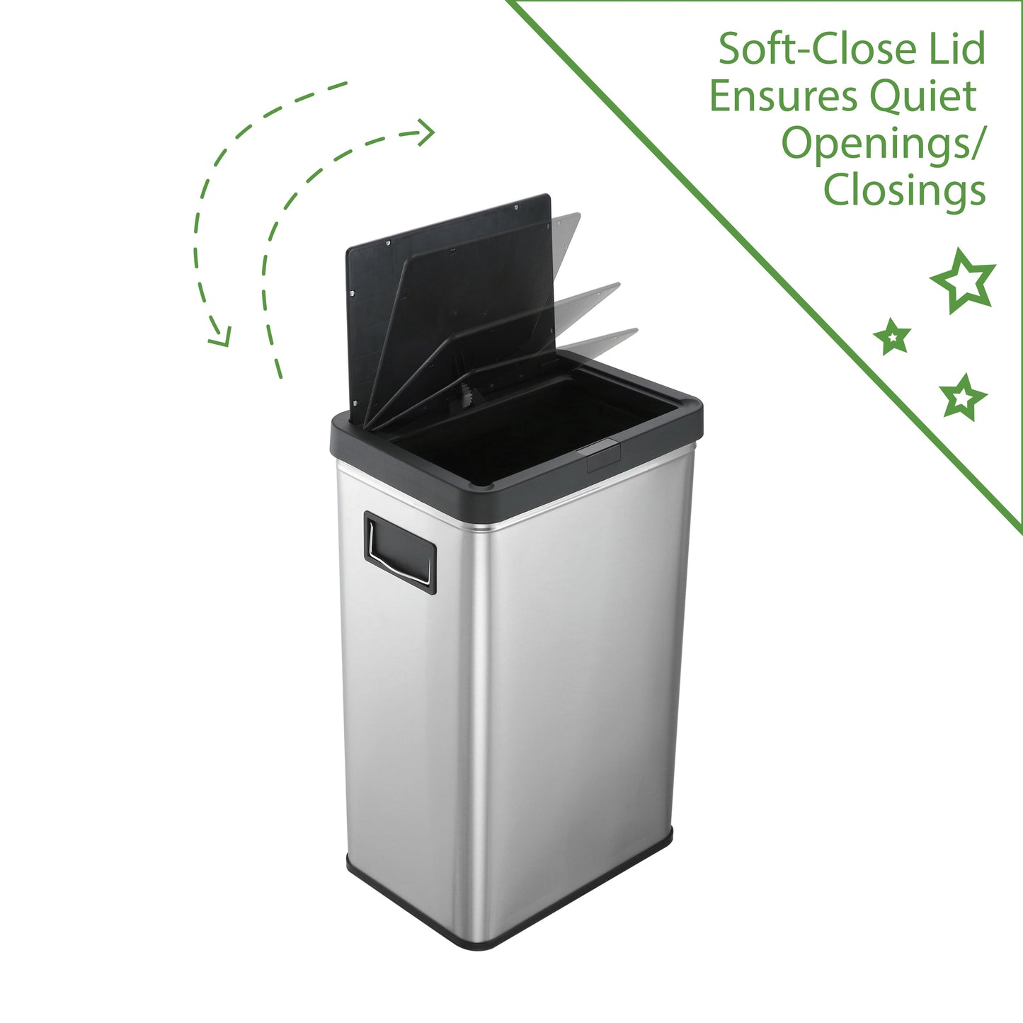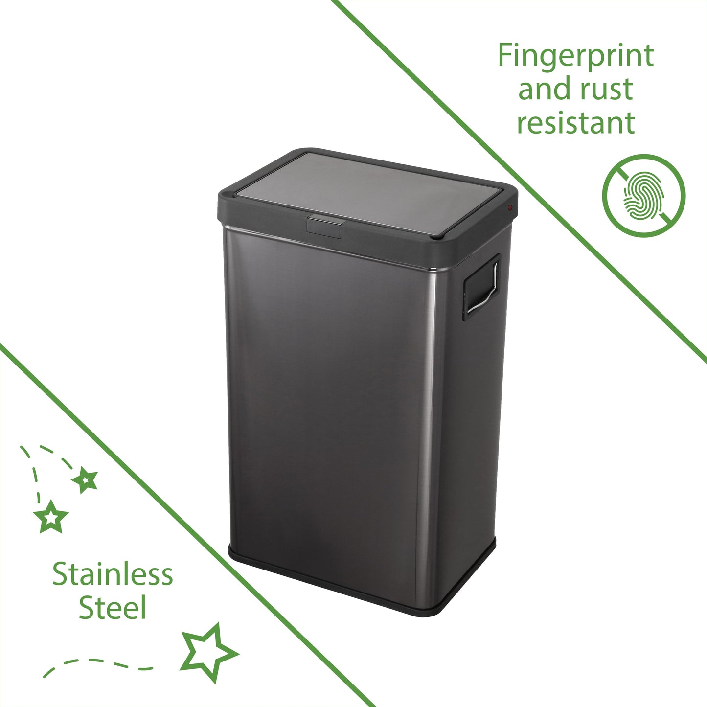 13.7 gal (52L) hand motion-activated sensor Kitchen Garbage Can, in black, adds a touch of luxury and convenience to any home. This fingerprint- and rust-resistant durable stainless-steel bin features a spacious lid opening allowing easy disposal of your waste. The convenient stay-open lid motion sensor technology employs dual sensors to pick up your presence in front of the bin and keeps the lid open until you walk away, thereby triggering the visual countdown timer to re-start before closing the lid. This technology helps prevent false lid openings. Its sleek 24.29" x 15.11" x 10.74" profile allows for a close fit against any wall or cabinet. The hand-motion activated lid provides over 15,000 opening/closing cycles per new 4 “C" battery set (providing the included Use and Care instructions are followed). Batteries not included. *- Hand Motion Sensor Open and Close 13.7 gal Kitchen Garbage Can. *- 15,000 lid openings per battery set. *- Easy-to-Clean Drip Tray *- Space Saving Slim Profile Design (24.29" x 15.11" x 10.74"). *- Fingerprint Resistant Stainless Steel