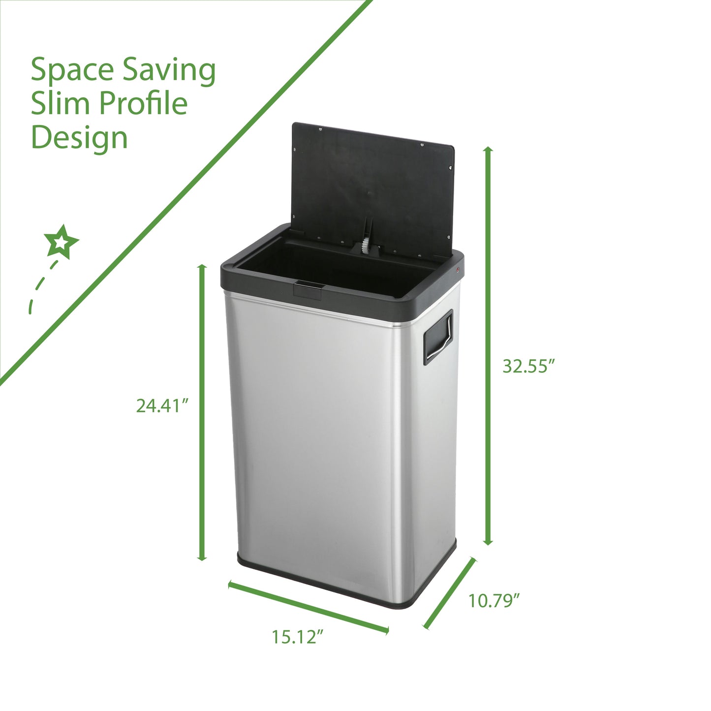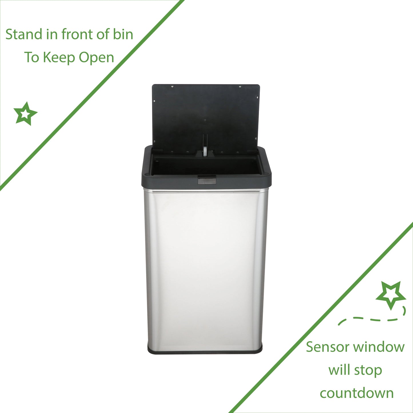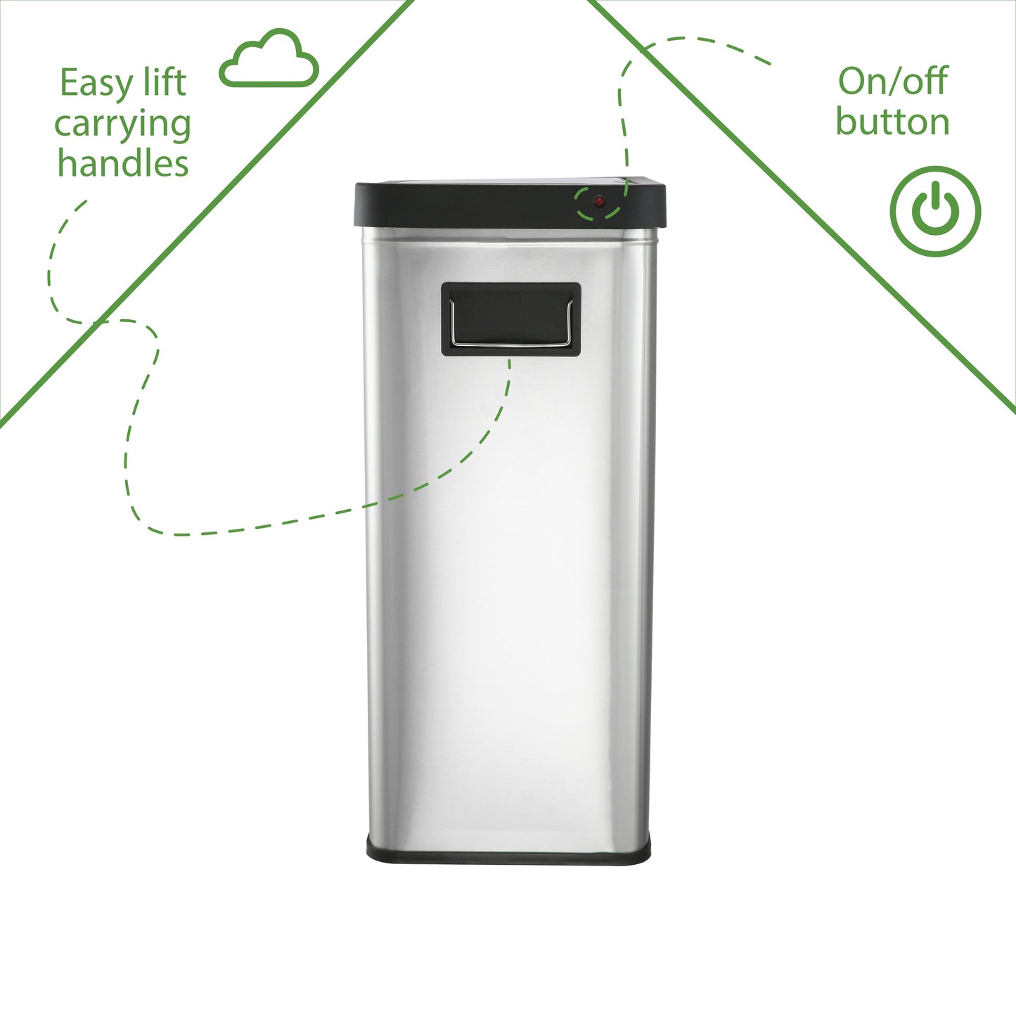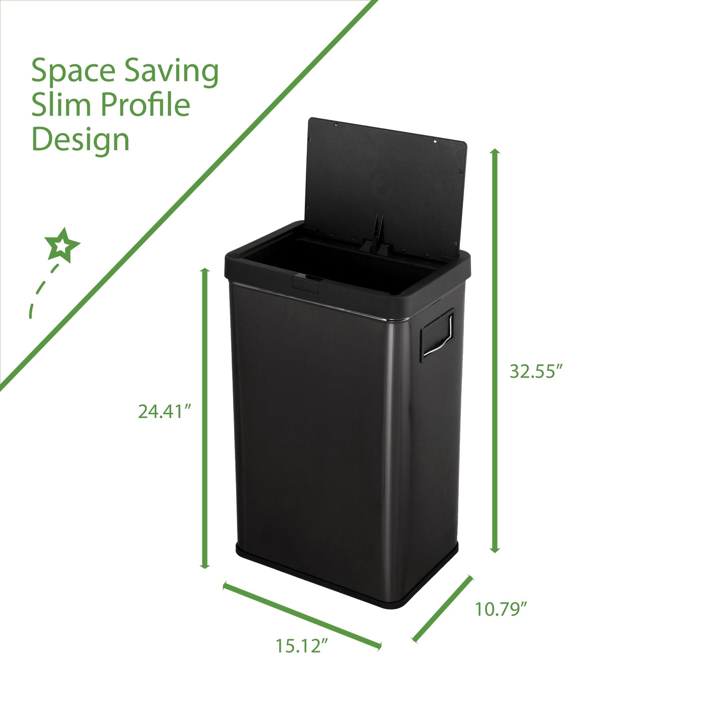 13.7 gal (52L) hand motion-activated sensor Kitchen Garbage Can, in black, adds a touch of luxury and convenience to any home. This fingerprint- and rust-resistant durable stainless-steel bin features a spacious lid opening allowing easy disposal of your waste. The convenient stay-open lid motion sensor technology employs dual sensors to pick up your presence in front of the bin and keeps the lid open until you walk away, thereby triggering the visual countdown timer to re-start before closing the lid. This technology helps prevent false lid openings. Its sleek 24.29" x 15.11" x 10.74" profile allows for a close fit against any wall or cabinet. The hand-motion activated lid provides over 15,000 opening/closing cycles per new 4 “C" battery set (providing the included Use and Care instructions are followed). Batteries not included. *- Hand Motion Sensor Open and Close 13.7 gal Kitchen Garbage Can. *- 15,000 lid openings per battery set. *- Easy-to-Clean Drip Tray *- Space Saving Slim Profile Design (24.29" x 15.11" x 10.74"). *- Fingerprint Resistant Stainless Steel