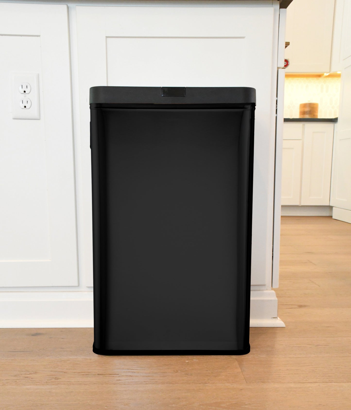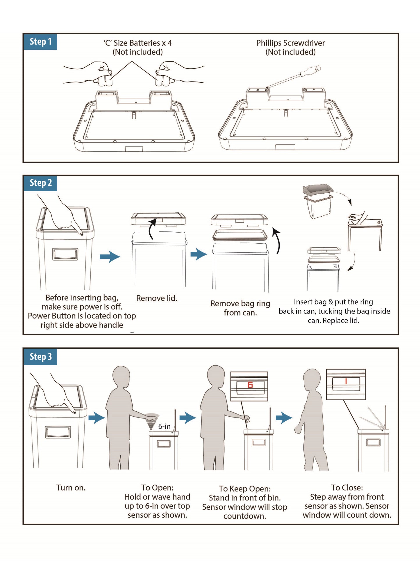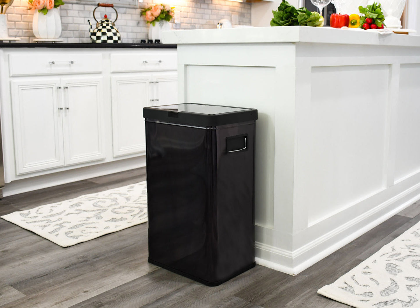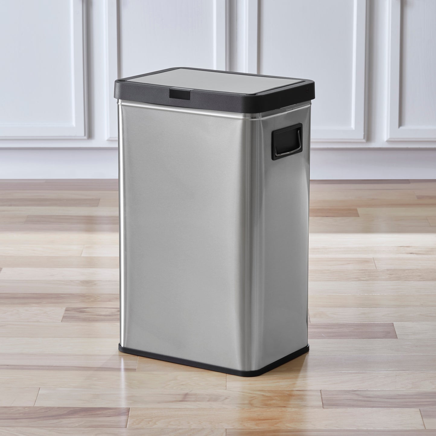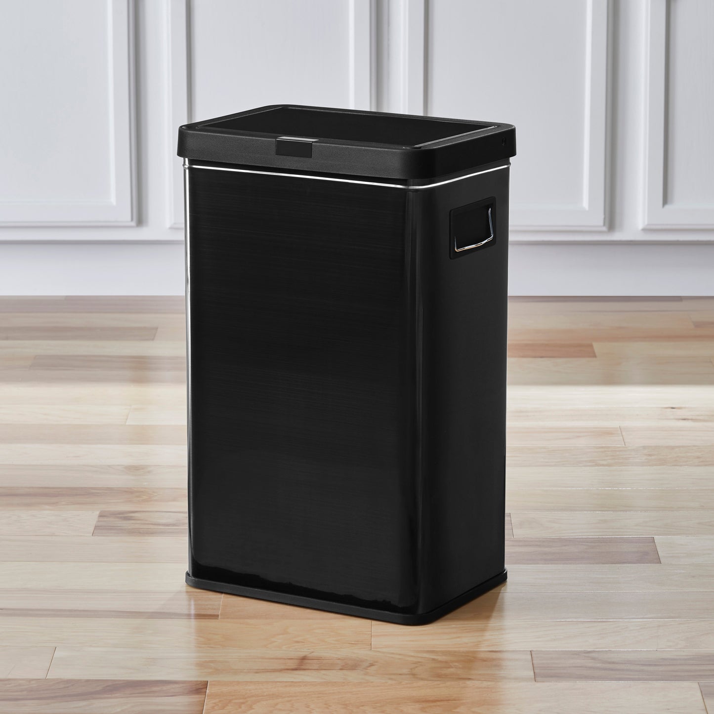 13.7 gal (52L) hand motion-activated sensor Kitchen Garbage Can, in black, adds a touch of luxury and convenience to any home. This fingerprint- and rust-resistant durable stainless-steel bin features a spacious lid opening allowing easy disposal of your waste. The convenient stay-open lid motion sensor technology employs dual sensors to pick up your presence in front of the bin and keeps the lid open until you walk away, thereby triggering the visual countdown timer to re-start before closing the lid. This technology helps prevent false lid openings. Its sleek 24.29" x 15.11" x 10.74" profile allows for a close fit against any wall or cabinet. The hand-motion activated lid provides over 15,000 opening/closing cycles per new 4 “C" battery set (providing the included Use and Care instructions are followed). Batteries not included. *- Hand Motion Sensor Open and Close 13.7 gal Kitchen Garbage Can. *- 15,000 lid openings per battery set. *- Easy-to-Clean Drip Tray *- Space Saving Slim Profile Design (24.29" x 15.11" x 10.74"). *- Fingerprint Resistant Stainless Steel