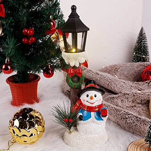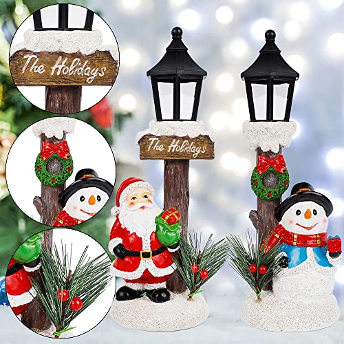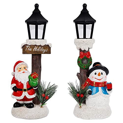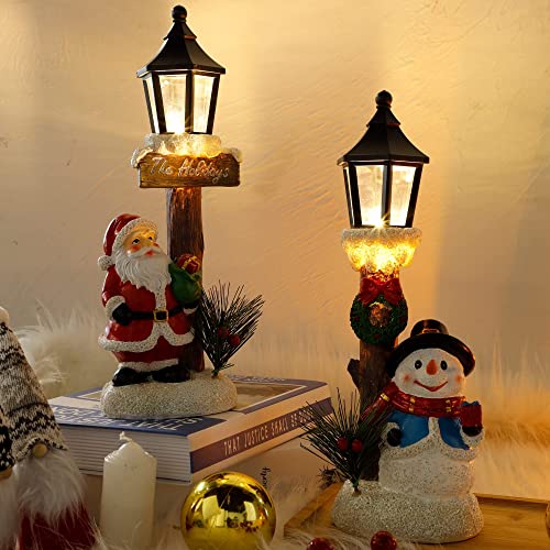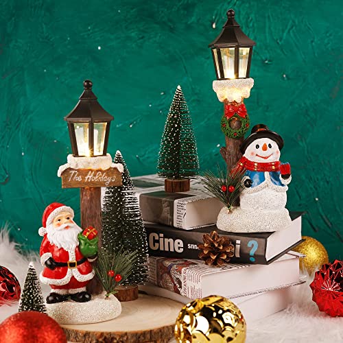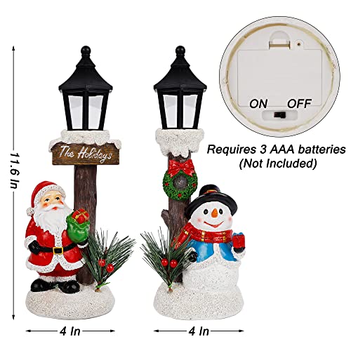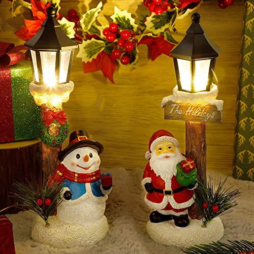 - UNIQUE TABLE ORNAMENTS: Christmas led lighted table ornaments are separately shaped in a Santa and a snowman with gifts on their hands, standing beside streetlights. The adorned pine needles and wreath give it a wonderful festive look to your Christmas decoration.