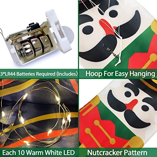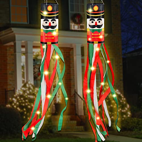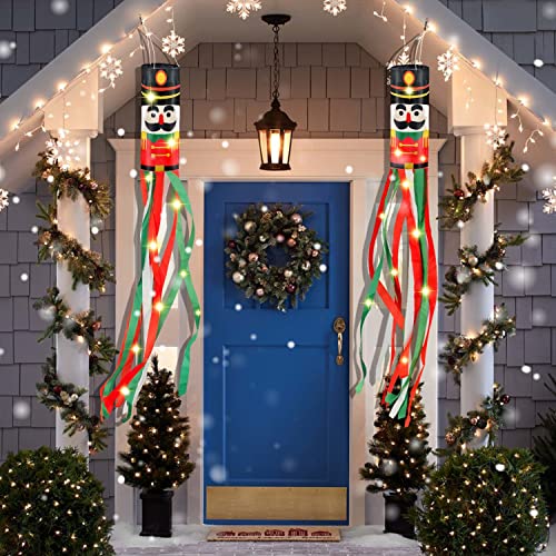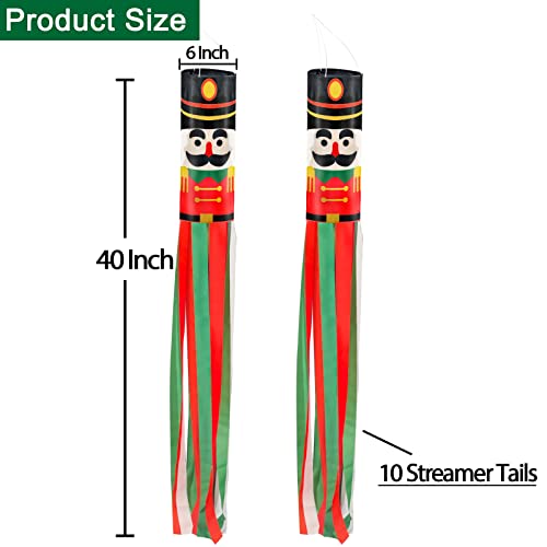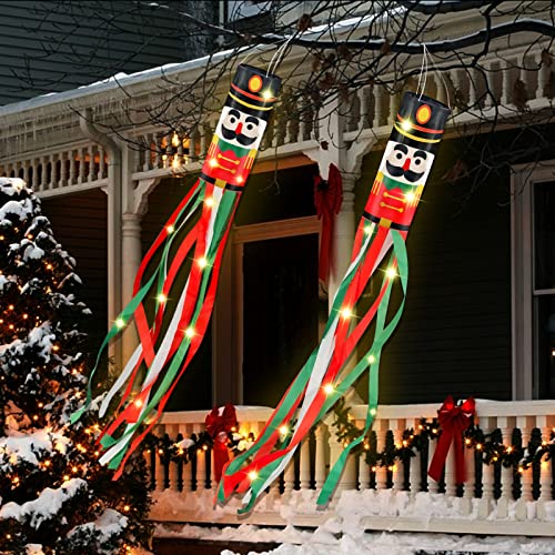 - [ 2 Pack Lighted Christmas Nutcracker Windsocks ] Pack of 2 Lighted Christmas Nutcracker Windsocks with 10 streamers tails(4 red + 4 green + 2 white), Each windsock measures 40 x 6 inch(length x width).