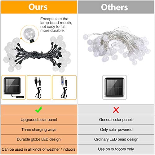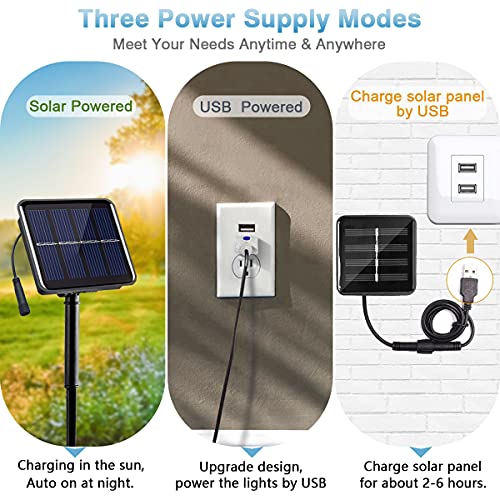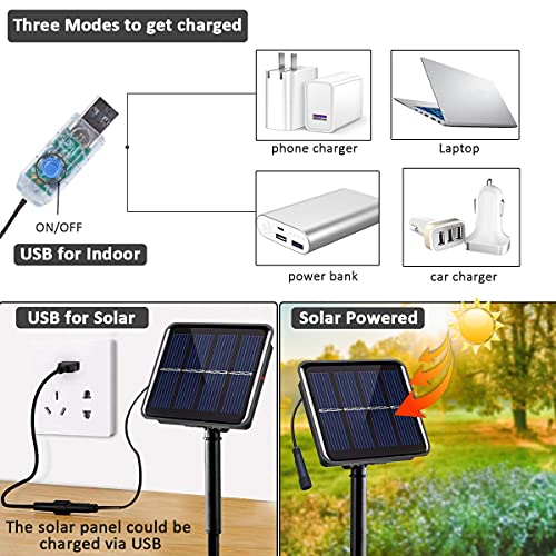 - 【Upgraded USB Powered for Indoor】When use the lights indoor or in a rainy day , you could take off the solar panel and connect the fairy lights plug in the female USB connector. Tips;The lighting effect under USB-powered will be a little brighter than solar powered.