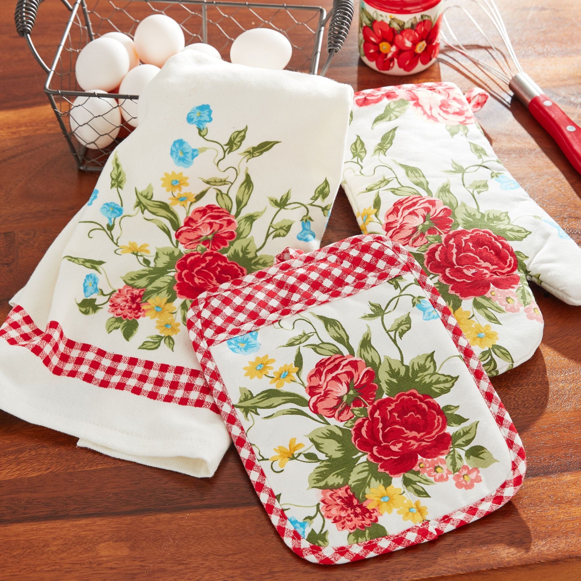 Adorn your kitchen and complete your vintage, rustic farmhouse style with Sweet Rose 3-Piece Kitchen Set. This three-piece kitchen set not only adds function to your cooking duties but adds a touch of style to your rustic farmhouse decor with the mixture of multi hue florals on a white background and red and white gingham plaid. The set includes one potholder, one full size kitchen mitt, and one kitchen towel. The set is made of 100 percent cotton, making them machine washable for easy care. Add country charm to your kitchen with Sweet Rose 3-Piece Kitchen Set. Meet Ree: Ree Drummond is a NY Times Best Selling Author, TV personality, social media phenom, and the woman behind the popular Pioneer Woman lifestyle blog that started it all. She's also a lover of butter, basset hounds, Ethel Merman, her hunky, cowboy husband Ladd, and their four kids. Her casual country style and delicious recipes have made her a go-to for all things cooking and entertaining. Sweet Rose 3-Piece Kitchen Set: Kitchen Towel, Oven Mitt & Pot Holder: *- Includes one potholder, one full size kitchen mitt, and one kitchen towel *- Features multi hue florals on a white background and red and white gingham plaid *- Adds a touch of style to your rustic farmhouse decor *- Mix and match with other The Pioneer Woman pieces *- Machine washable for easy care