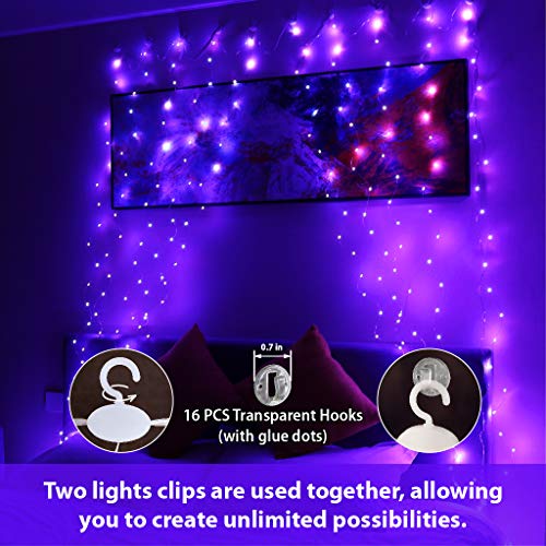 - · 【360° Rotatable hooks】: Upgrade 360° Rotation Clips on each drop string is mainly used for hooking on curtains. It can be hung at any angle, such as on wall, window or other surface. Also includes 16 sets of Damage-free adhesive hooks. No nails needed and holds strongly & removes cleanly. Both of these two clips make the curtain light easily to be hung for some special places, not only limited to windows, but also can be hung on flat walls, glass, porches, eaves, etc.