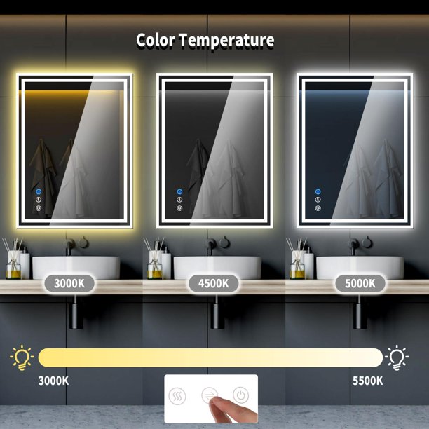 Bathroom mirror with LED light, Made of high quality glass can be used for long time in Home. High tech Intelligent double light-transmitting edges bathroom vanity makeup mirror with defogging function from inside outside. Touch sensor button can adjustable mirror color brightness from 3000K-5500K to meet the needs of different light. Brightness can be adjusted freely from 1 % to 100%. 24"x32" large size bathroom mirrors wall mounted design, it is space-saving. Bright mirror can make your bathroom or living room can be more spacious, Better mood. Perfect for bathroom, bedroom, dress room, powder room and more. Are you ready to renovate your bathroom? Is your living room darker? Our LED light bathroom mirror will be your choice. 1. Elegant Bright & Beautiful mirror, Bathroom Mirror made of high quality glass, clear, waterproof and durable 2. Large Size: Wall mounted rectangle mirror(24"x32"), Can be hanged horizontally or vertically. 3. LED Light Double Light Transmission Edge: Vanity Makeup Mirror with LED Light, Adjust the brightness of the mirror according to your needs. 4. Anti-Fog Function: Defogging from the inside out, Clear and bright, Ideal for your bathroom. 5. Dimmable Brightness: Long press the light button to adjust the brightness of the mirror light. Key Features: *- Adjustable Bathroom Mirror for Wall: The lighted bathroom mirror adopts smart touch switch control design. You can freely switch 3 kinds of lights-daylight/natural light/warm light. The color Temperature ranges from 3000K-5500K offers you choices of different light colors for different purposes to meet the needs of different light. *- Anti-Fog Bathroom Mirrors for Vanity: The anti-fog function is individually controlled by the touch button. You can turn on/off the anti-fog function according to your needs. Anti-fog from inside to outside. The built-in anti-fog function means you don't need to wipe or rinse the mirror frequently. Ensures clear reflection images in the bathroom water vapor environment. More bright and convenient. *- Waterproof LED Mirror for Bathroom: Outline illuminated bathroom wall mirror with energy-efficient LED lights, IPX6 waterproof grade, safe and durable to use. The waterproof LED strip has a leak-proof function and is safer to use. LED Wall Mirror adds a touch of contemporary style and soft illuminating light to any room. With an outlining light display, this mirror will illuminate your room, your face, and your smile. *- Adjustable Brightness Mirrors: Brightness can be adjusted freely from 1 % to 100% freely by long-touch the button according to the environment. Ideal for bathroom, Livingroom or entryway. *- Great Design: Modern classi c exterior design make your bathroom look more cool and luxurious, perfect for bathroom, bedroom as makeup or lighting decoration. Product Parameter *- Material: Glass *- Color: Silver *- Mounting Type: Wall Mount *- Color Temperature Ranges: 3000K-5500K *- Shape: Rectangular *- Size: 24x32x1.6inch *- The main function: LED light, Adjustable brightness, Adjustable Color Temperature, Anti-Fog *- Installation method: Horizontal/Vertical Installation *- Quantity: 1Pc Package Content: *- 1 x Wall Mounted Vanity Mirror *- Note: Due to the difference between different monitors, the picture may not reflect the actual color of the item. *- ✔Large Size: 24x32x1.6inch large rectangle bathroom mirrors. Hanging firmly on the wall, will not fall easily. In addition, Through the reflection of the bathroom mirror, your bathroom or living room can be more spacious. *- ✔Anti-Fog LED Mirror: Anti-fog function ensures clear reflection images in the bathroom water vapor environment, just press the switch to automatically enter the anti-fog state. *- ✔Adjustable Brightness: Brightness can be adjusted freely from 1 % to 100% freely by long-touch the button according to the environment. *- ✔Horizontal/Vertical Installation: Two installation methods, which can be installed horizontally or vertically according to your needs.