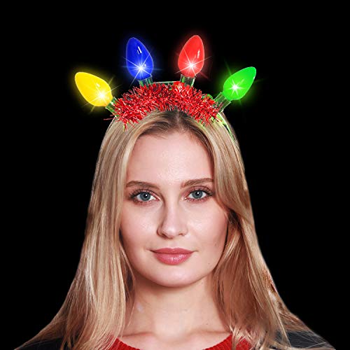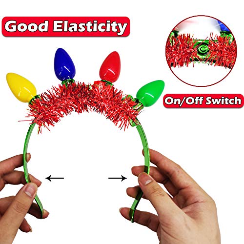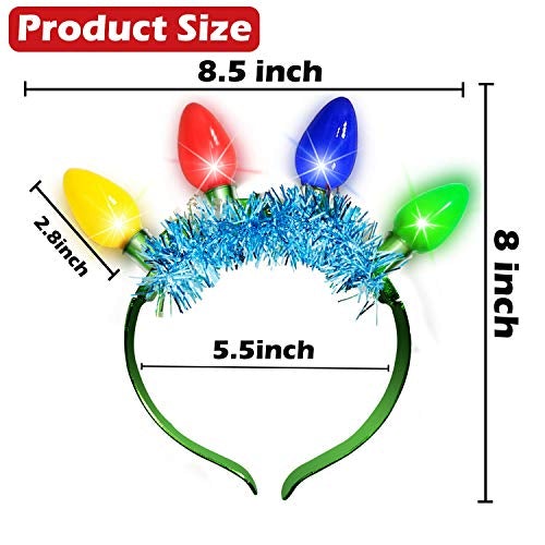 - [ 4 Pack Novelty Christmas Headbands ] Packs of 4 Christmas headbands feature with 4 Large 2.8 inches Multicolor LED Light Up Bulbs and tinsels(green, red, silver and colorful).