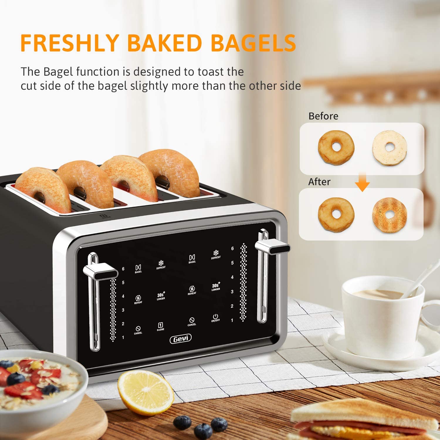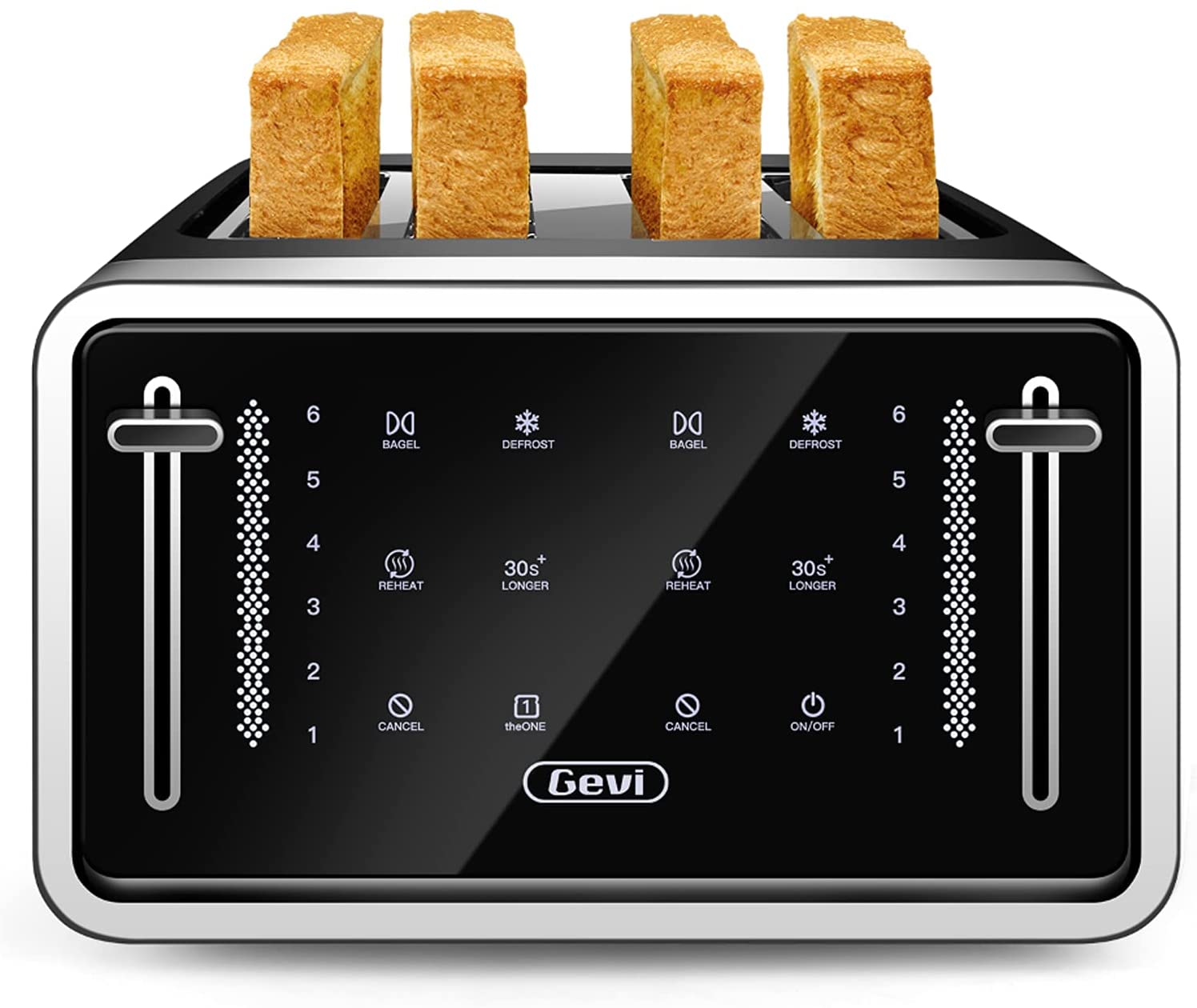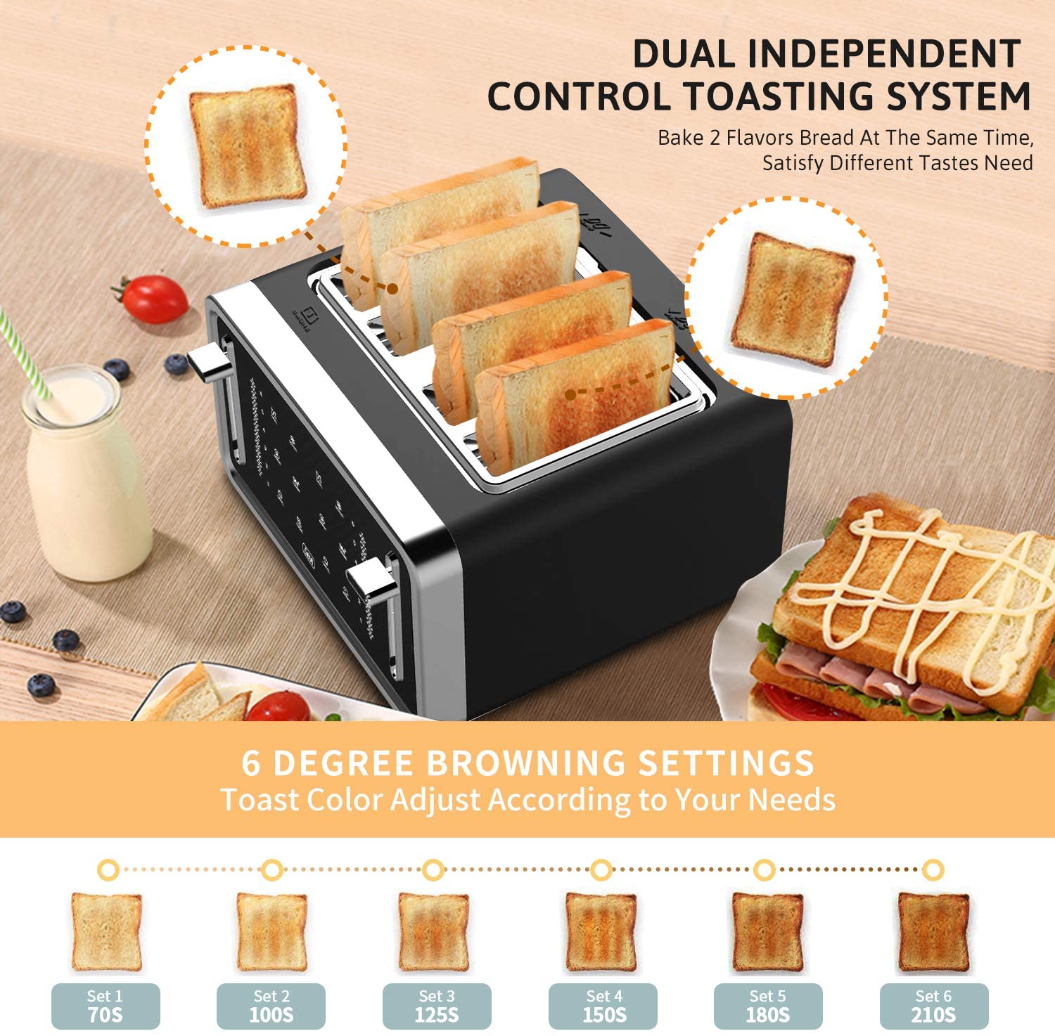 .4 EXTRA-WIDE BREAD TOASTING SLOTS : This Best Rated Prime 4 Slice Toasters measures with Four 1.18" wide slots which can be used to bake different types of bread,such as waffle,or thick artisanal bread.Dual High Lift Lever is designed to bake different sizes of bread and take bread out safely. LED DISPLAYED TOUCH SCREEN :4 Slice Toaster comes with the LED display control panel. The digital displayed toaster built-in LED screen indicating toasting setting, making it easy to see the choice of shade setting.There is a light-bar near the lever that will illuminate, and parts of it will extinguish as the toasting gets closer to completion.Convenient to know the process of toasting. 6 TOAST SHADE SETTINGS : Choosing from lightly golden to deep(1-6) dark toasted slice.It heats the bread evenly and to get the favorable toasting color results for individual preferences, 6 degree and time of baking can be set, choose different degree according to the thickness of bread. The adjustable modes of the toaster are ranged from 1 to 6, if you are not satisfied with the browning level,you can press the longer function icon to add the time of toast or bagel. BASIC FUNCTION OF BAGEL, DEFROST, REHEAT ,CANCEL,THEONE and LONGER : Six screen touch buttons for toast functions ,easily pressing the icons to choose the function you need and control the state of toasts for ideal results. (Bagels: toast one side and keep other side warm; Defrost: Thaw frozen bread out; Reheat: Heat the cold bread; Cancel: Stop toasting at any time; The ONE: Designed to toast both side of only one slice of bread evenly ; Longer: Extend the toasting time by 30s .) DUAL INDEPENDENT CONTROL PANELS : Dual Independent Control Panels It equivalent to 2 toasters, prepare breakfast twice fast than a 2-slice toaster! Easy to Clean with Removable Crumb Tray! *- SPECIFICATIONS : Color: Black Material: Stainless Steel, Plastic Net Weight: 6.67 pounds Item Dimension: 10.5 x 11.1 x 7.4 inches (L x W x H) Capacity:Toaster 4 Slice Wattage:1800W Temperature Range:6 Baking Color *- Features : 4 Extra-Wide Bread Toasting Slots with Double Independent Control 6 Toast Browning Settings, meet all your family different toast needs Basic Selections of Bagel,Defrost,Reheat and Cancel 2 Removable Crumb Trays for easy cleaning Humanized Design Carriage Handles, pop up when finished toasting or lift up manually when toasting. *- WHAT YOU GET : 1 X 4-Slice Toaster(ETL Safety Certified),1 X User Manual