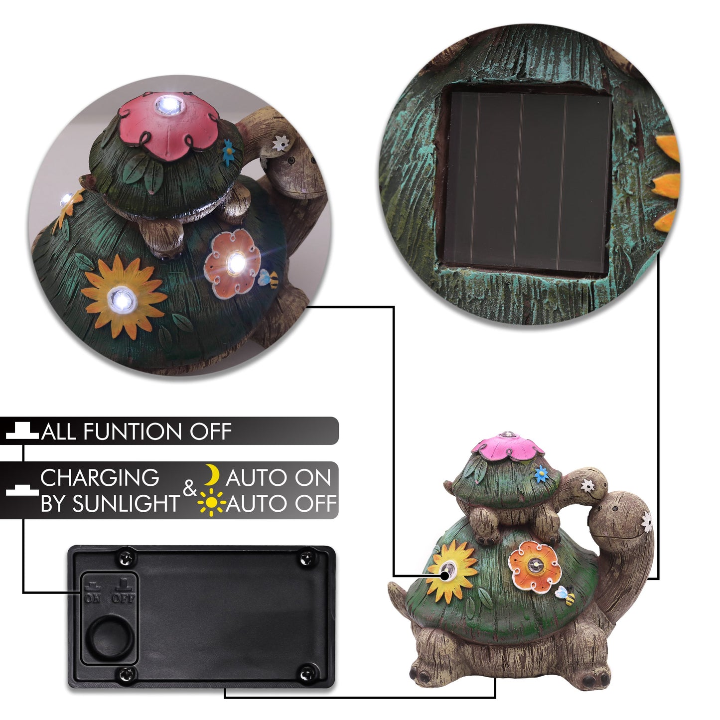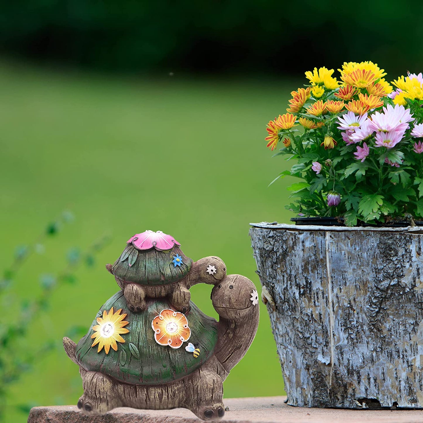 Mother and Baby Turtle Garden Statues. Animal Statues for Garden Decor. Tortoise Outdoor Statue with Solar Lights. Resin Lawn Ornaments for Porch Decor. Add a touch of whimsy to your garden with this adorable turtle with a baby on board. It is made from durable resin by hand painting. The resin statues powered by a solar panel. The solar garden light absorb energy during the day. And it lights up at night automatically. Perfect for any place with direct sunlight such as outdoor patio, garden, porch, lawn, pathway, or driveway, etc. Garden Statues with Solar Powered Lights - Great addition to your garden decor! *- Measures: 6.5 in x 6.7 in x 4.3 in *- Material: Resin Our Advantages: *- 【Original Design】 TERESA'S COLLECTIONS is a retail brand adhering to original designs. Inspired by family love, mother turtle carrrying baby turtle waiting for daddy to come home. Bring warmth and happiness to brighten up you garden. *- 【Premium Quality】 This garden statue made of durable resin materials, waterproof and anti-fading. The product is equipped with advanced solar chips, which can light up for 8 hours. *- 【Exquisite Craftsmanship】 Each product is sculpted and molded by skilled technicians, and the exquisite effect of the product is highlighted by hand painting. *- 【Solar Light】 Please turn on the button at the bottom of the statue before use. Then keep the product under the sun to ensure sufficient sunlight. Charging in the daytime and automatically lights up at night. *- 【Application】 This garden figurine is 6.7 x 4.3 x 6.5 inches, suitable to use as garden, outdoor, patio, lawn, yard, and many areas of your house, also an excellent gift for your family and friends.
