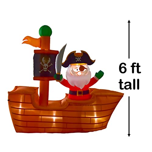 6-Ft Christmas Pirate Santa on A Wooden Flag Inflatable Ship w/ Built-in LED Lights