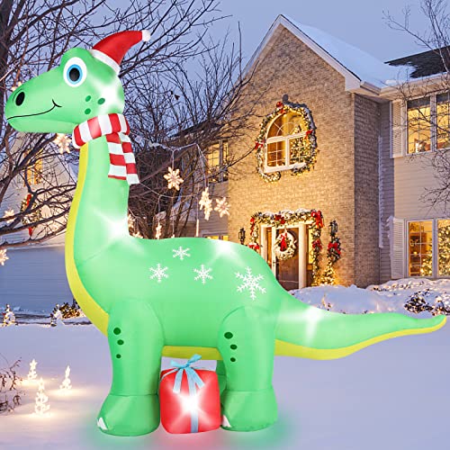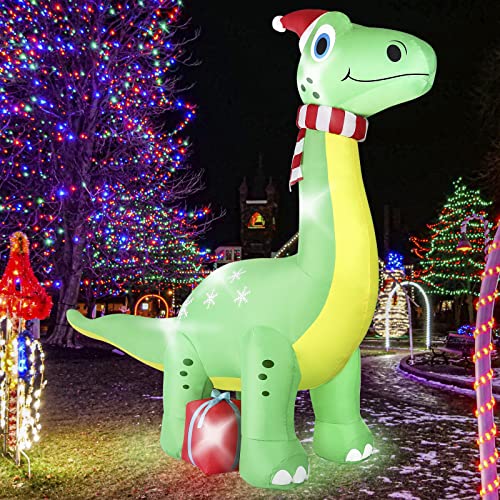 - 【6FT Cute Dinosaur Christmas Inflatables Decorations】The cute brachiosaurus dinosaur are ready to bring you a funny and joyful Christmas. It has a big friendly smile on its face, wearing a cute Christmas hat, with a gift box on its foot. lt want to delight your family, friends and neighbors, giving people the best christmas wishes. Everyone will be attracted by this light up inflatable christmas dinosaur decor.