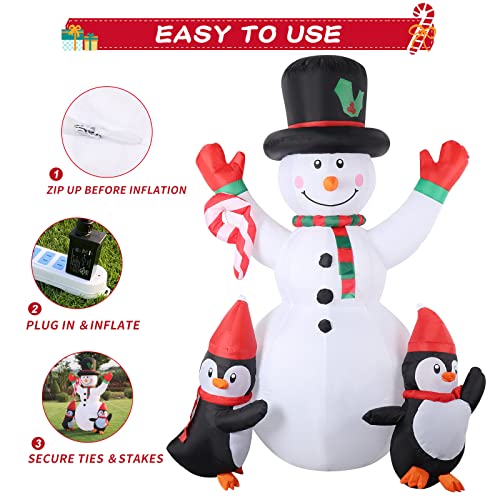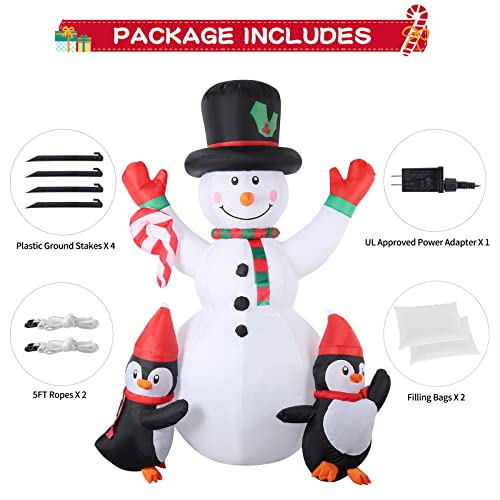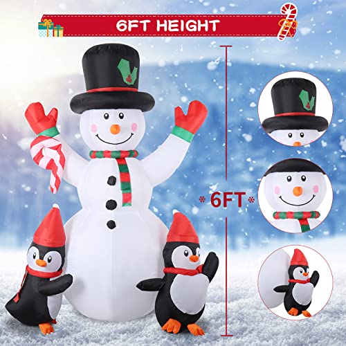 - 【Perfect Outdoor Christmas Decorations】The funny 6ft height Christmas inflatable snowman with two cute penguins, appearing happy welcome gesture, bring your family with joy and happiness, attract your guests and neighbors. The blow up snowman penguins inflatable is ideal for Christmas outdoor yard decoration, Christmas event decoration, Christmas night event, holiday blow-ups, party event decor etc.