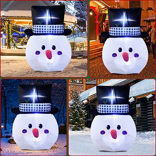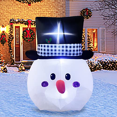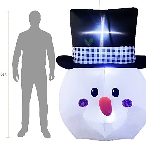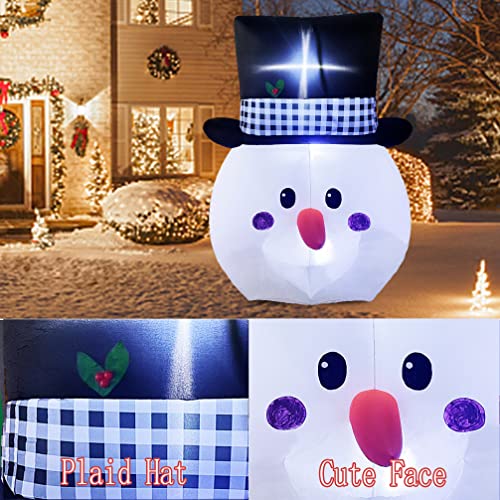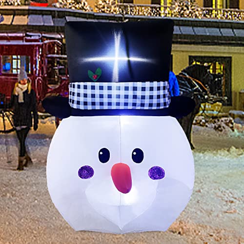 - Large Snowman Head with Gentleman Hat: 6-foot snowman head with cute face and plaid gentleman hat, will make it the most eye-catching snowman inflatable Christmas decorations in the yard
