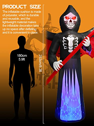 - đ»ă8.3FT Halloween DecorationsăHalloween inflatables outdoor scary ghost reaper with 6pcs plastic piles, 2pcs ropes, and 2pcs metal buckles. Installed in the porch or courtyard to enjoy Halloween Holiday party with your family and creating a spooky atmosphere for guests and neighbors.