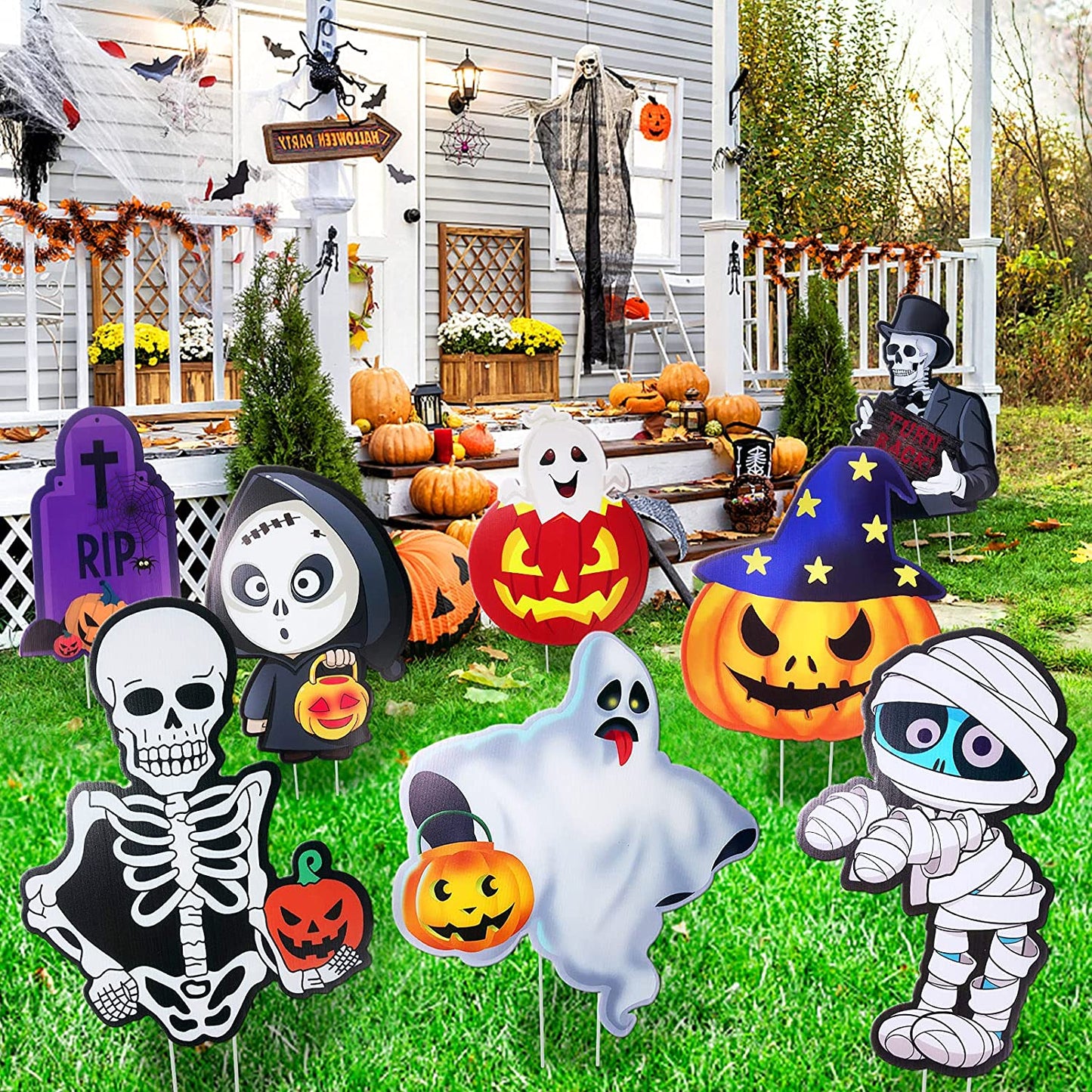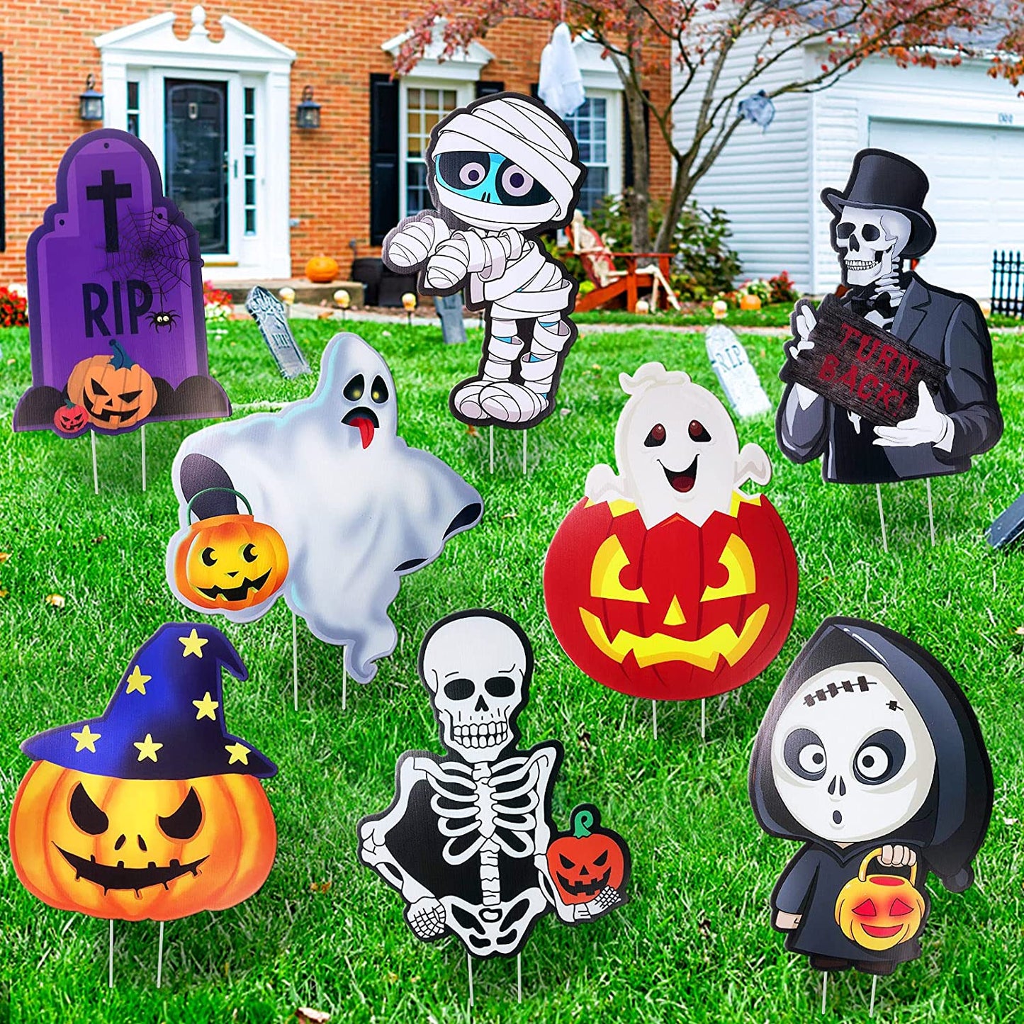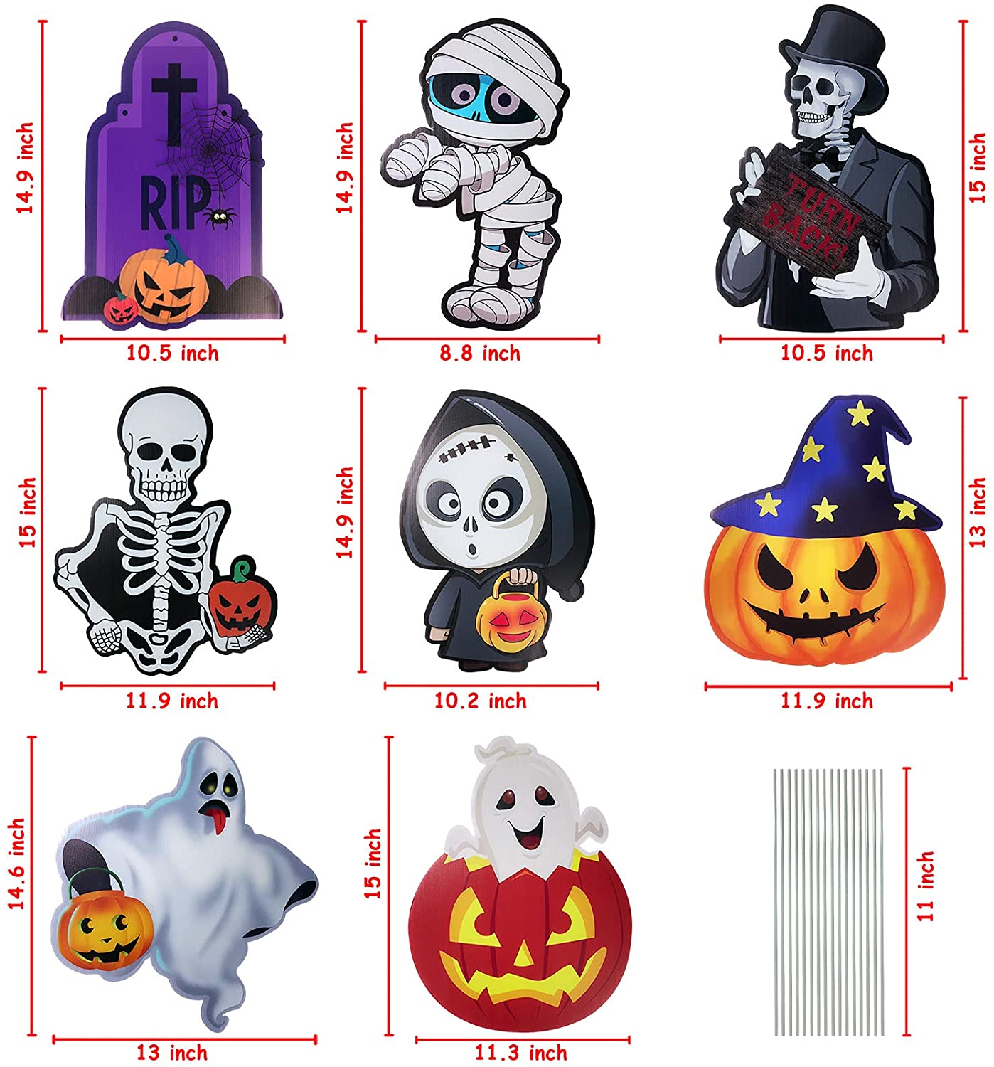 Perfect for Halloween lawn decorations, Halloween yard decorations, outdoor Halloween props, Halloween party, skeleton prop themed party, trick or treating and everyday play, and more Fun pumpkin Halloween yard decor for home, office, party, for both adults and kids Great Material These yard sign halloween decorations are made of premium PP plate sheet, which is durable and non-toxic. They are perfect outdoor decorations for your yard for Halloween! Holds tightly on ground Making of great material, these corrugate signs can stand solidly on the ground. They won't be knock down by wind and rain easily! Waterproof These signs are waterpoof so there is no need to worry about them in rainy days. You just need to simply insert two heavy-duty plastic stakes into each Halloween party signs and plug in the ground to display! *- Durable and Waterproof: Halloween signs for lawn & yard are made of durable corrugate in friendly & spooky patter. Our outdoor yard signs are waterproof and there is no need to worry about it even on rainy days *- Cute Yard Sign Stakes: Friendly and spooky style Halloween outdoor decorations include 8 different shapes of stake signs, 2 pumpkins, 2 ghosts, 2 skeletons, 1 Mummy, and 1 tombstone, 16 stakes *- Easy to Use: Each shape Halloween yard sign comes with two stakes, simply insert two heavy-duty plastic stakes into each garden stake and press into the ground *- Large Size: 9 Cute design Halloween yard stake signs with a stake will attracting children’s attention. Decorating your Halloween party with these adorable and fun Halloween party supplies will create an exciting and cute Halloween festival atmosphere for kids, toddlers, friends, and the neighborhood *- Exciting Halloween Lawn Decorations: This set of lawn decorations is making it easy to display on the lawn and courtyard. Perfect for yard and lawn decorations, outdoor Halloween props, ghost-themed parties, trick or treating and more!