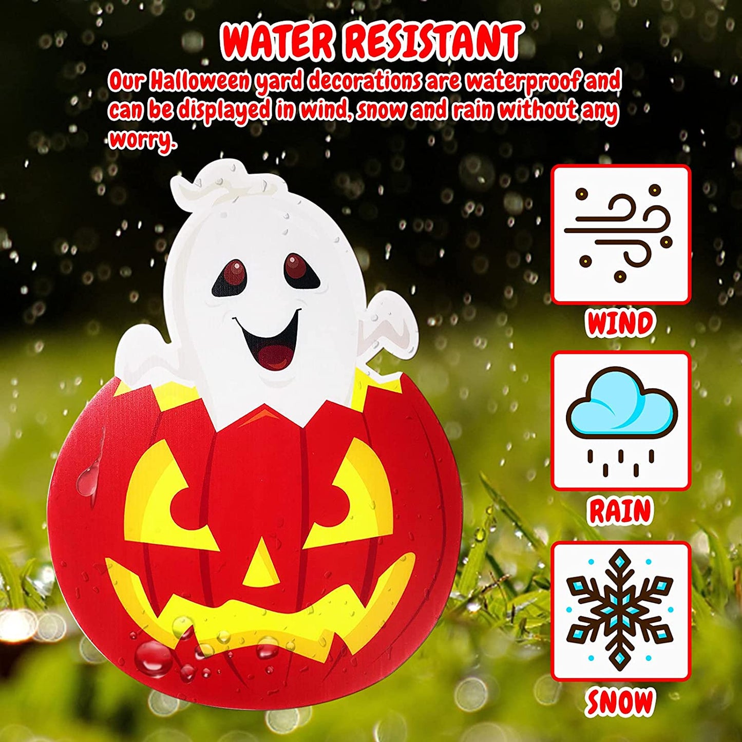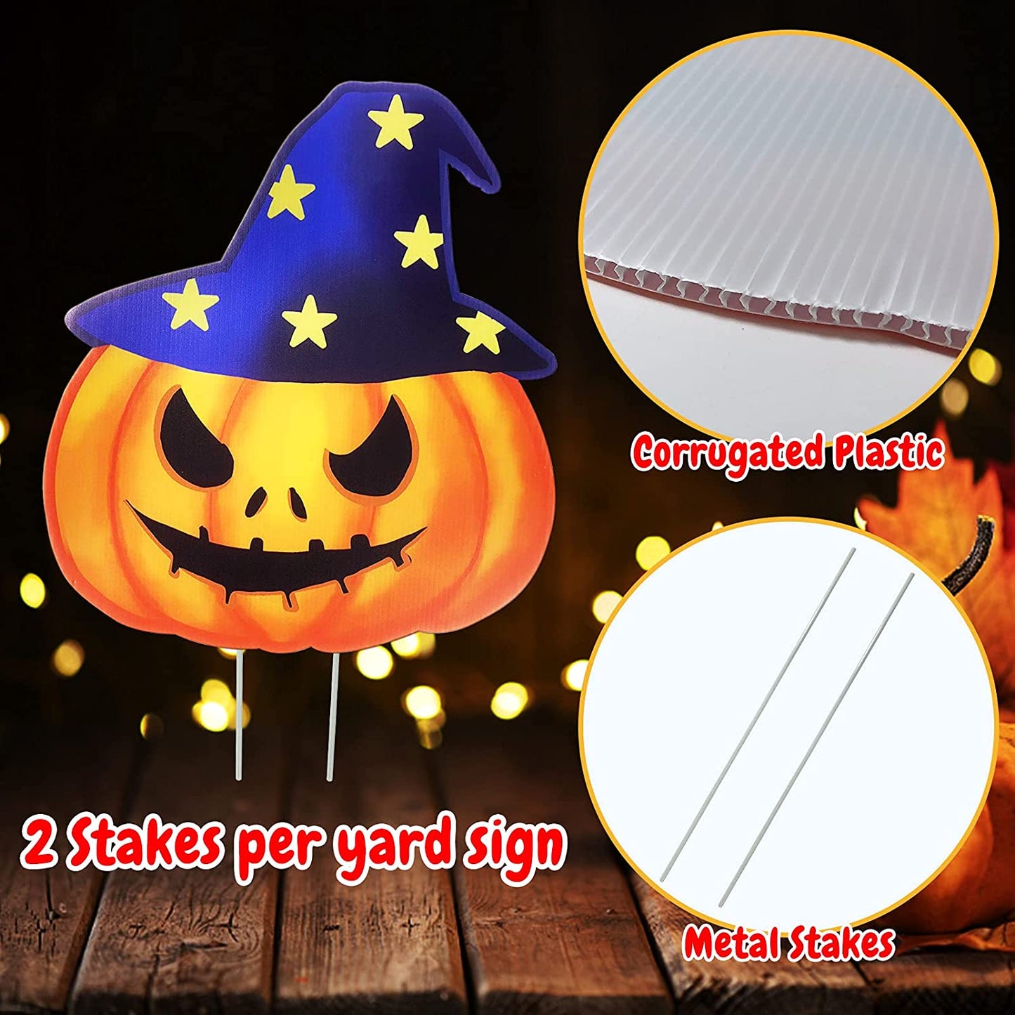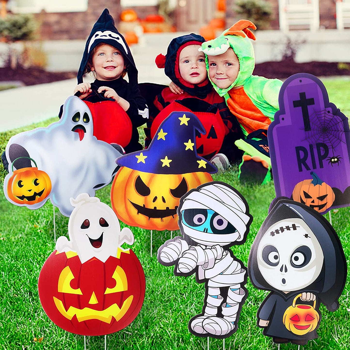 Perfect for Halloween lawn decorations, Halloween yard decorations, outdoor Halloween props, Halloween party, skeleton prop themed party, trick or treating and everyday play, and more Fun pumpkin Halloween yard decor for home, office, party, for both adults and kids Great Material These yard sign halloween decorations are made of premium PP plate sheet, which is durable and non-toxic. They are perfect outdoor decorations for your yard for Halloween! Holds tightly on ground Making of great material, these corrugate signs can stand solidly on the ground. They won't be knock down by wind and rain easily! Waterproof These signs are waterpoof so there is no need to worry about them in rainy days. You just need to simply insert two heavy-duty plastic stakes into each Halloween party signs and plug in the ground to display! *- Durable and Waterproof: Halloween signs for lawn & yard are made of durable corrugate in friendly & spooky patter. Our outdoor yard signs are waterproof and there is no need to worry about it even on rainy days *- Cute Yard Sign Stakes: Friendly and spooky style Halloween outdoor decorations include 8 different shapes of stake signs, 2 pumpkins, 2 ghosts, 2 skeletons, 1 Mummy, and 1 tombstone, 16 stakes *- Easy to Use: Each shape Halloween yard sign comes with two stakes, simply insert two heavy-duty plastic stakes into each garden stake and press into the ground *- Large Size: 9 Cute design Halloween yard stake signs with a stake will attracting children’s attention. Decorating your Halloween party with these adorable and fun Halloween party supplies will create an exciting and cute Halloween festival atmosphere for kids, toddlers, friends, and the neighborhood *- Exciting Halloween Lawn Decorations: This set of lawn decorations is making it easy to display on the lawn and courtyard. Perfect for yard and lawn decorations, outdoor Halloween props, ghost-themed parties, trick or treating and more!