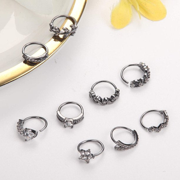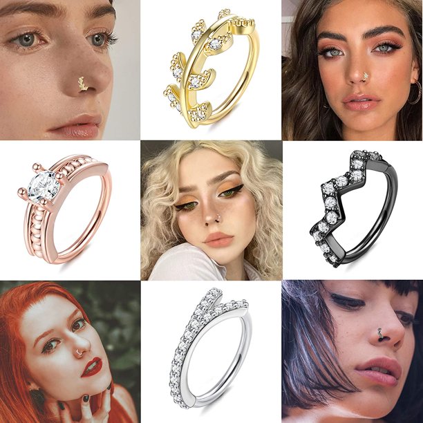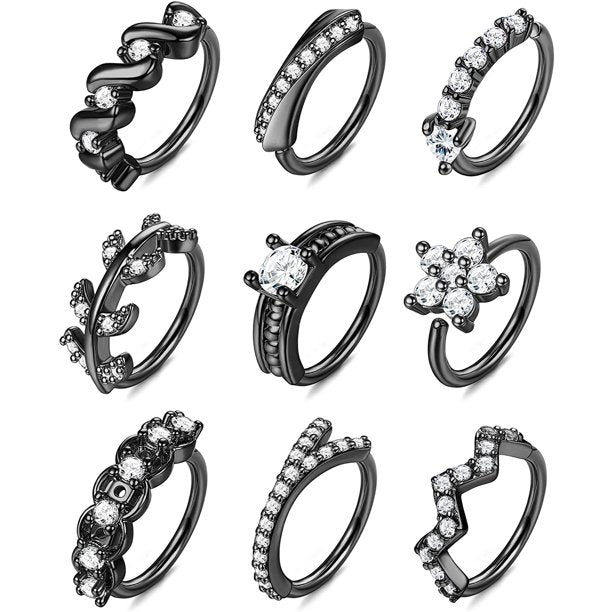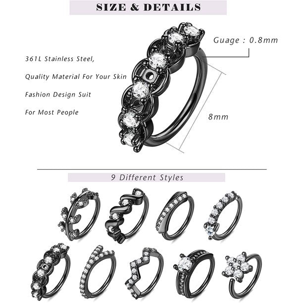 - Nose Ring Hoop--You Can Get 9 pcs 20G Nose Ring In One Order With Different Style, Including Flower Nose Ring, Clear CZ Paved Line Ring Nose Ring, Leaf Nose Ring, etc. These Cute And Shine Piercing Can Wear On Your Nose Or Ear