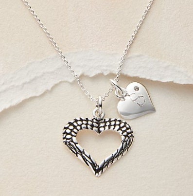 A pair of hearts take flight in this uplifting necklace that reminds us of God's love and protection. The lovely open heart has a feathered texture. The other heart is accented by a shimmering cubic zirconia.