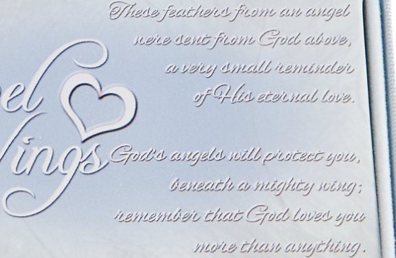 Comes beautifully gift boxed with the poem "Angel Wings", which begins "These feathers from an angel were sent by God above, a very small reminder of His eternal love..."