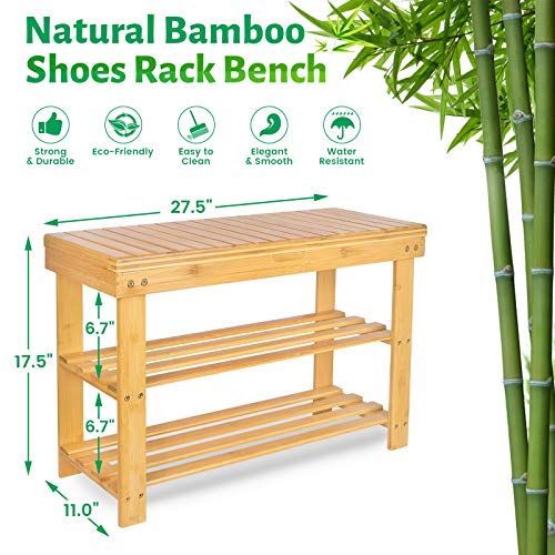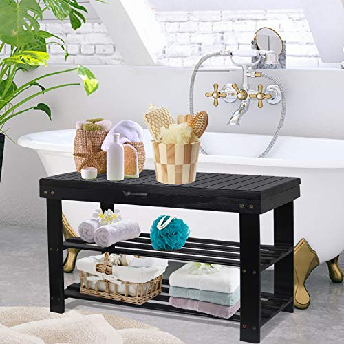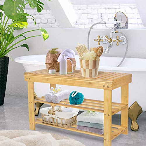 - MULTIFUNCTIONAL:The bamboo bench can be used as a shoe rack in the entry way, as a supplies shelf in the bathroom, also as a plant stand or sundry organizer in your garden, living room, patio ,kitchen ,etc.