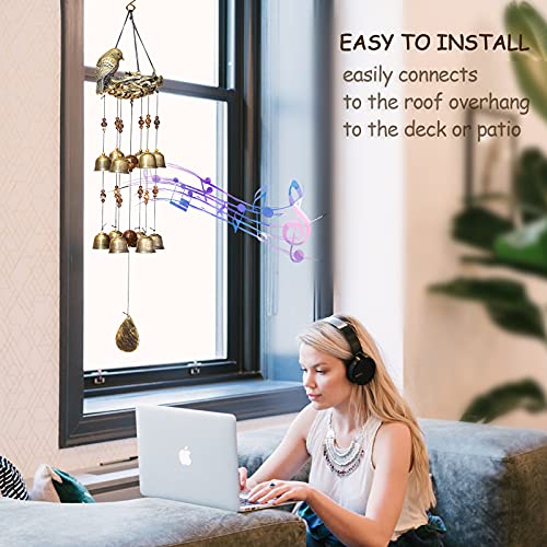 - 【Fantastic design style】The wind chime is the shape of a bird nest. A big bird is guarding her two babies. The picture is very harmonious and kind. It's about 25 inches longThe bronze resin bird's nest is very mysterious and 12 high-quality copper alloy match with many small blessing beads. easy to clean and not easy to rustThe sound makes people feel comfortable and relaxed