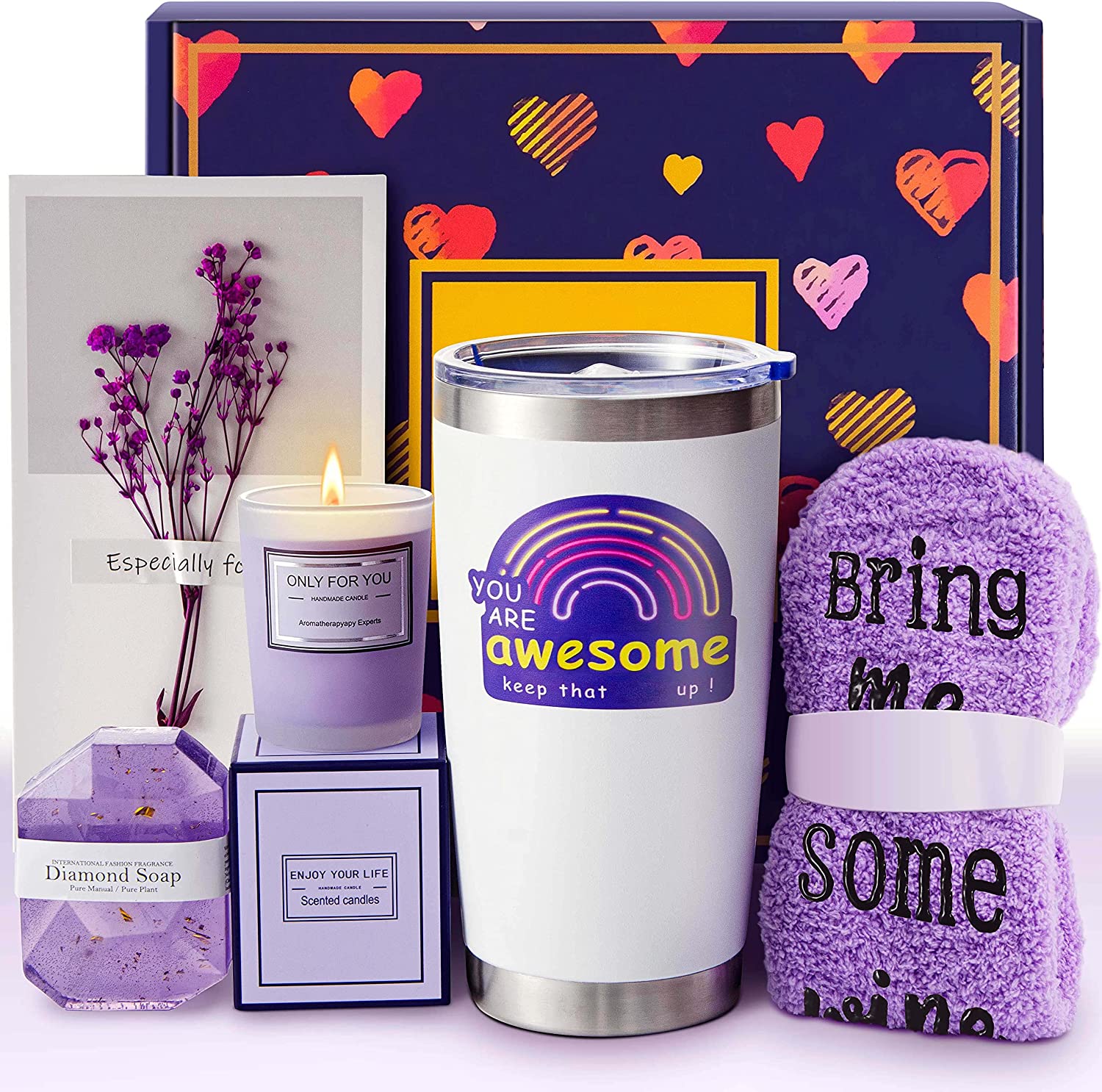- ✨CHRISTMAS GIFTS FOR WOMEN - This women gift set includes 20oz travel tumbler, pale purple cozy socks, lavender scented candle, Diamond soap, and a greeting card for your special message, purple gift box. 20 oz insulated coffee tumbler with the words "you are awesome keep that up", inspirational words will give you power and happiness. The full set of purple will give her a different vision and feeling - perfect inspirational Christmas gifts for women