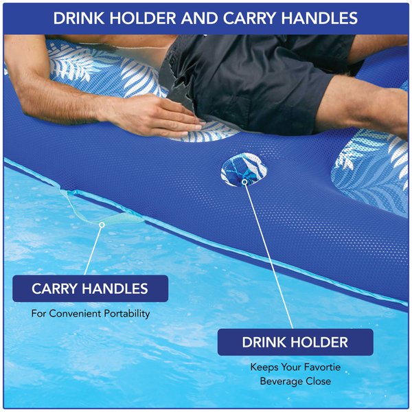 Easily inflate and deflate this Adult luxe Unisex pool float with the Duo Lock Valve Inflation System. Soft-to-the-touch Cool Weave mesh fabric is quick drying and allows water to drain easily, helping in the prevention of mildew and provides cooling relief while lounging in the sun. Pick up and go at a moment's notice with the utmost of ease as this lounger conveniently folds and includes handles for your travel comfort. Unwind and enjoy the supportive comfort of the cushioned headrest and take advantage of the convenience of the integrated drink holder as you float on by. When inflated, the Ultimate Luxury Recliner measures 70” L x 36” W. It is recommended for ages 15 and up and has a weight capacity of 300 lbs. *- Ultra-Comfortable, Extra-long lounge *- Cool Weave mesh fabric covers lounge and seating area *- Comfortable, supportive headrest *- Unisex *- Integrated drink holder and carry handles *- Easily inflates and deflates with the Duo lock Inflation System *- Lounge folds for portability and storage *- Inflated size is 70” L x 36” W (178cm x 91cm) *- Weight capacity 300 lbs. *- Recommended age: 15 years and up