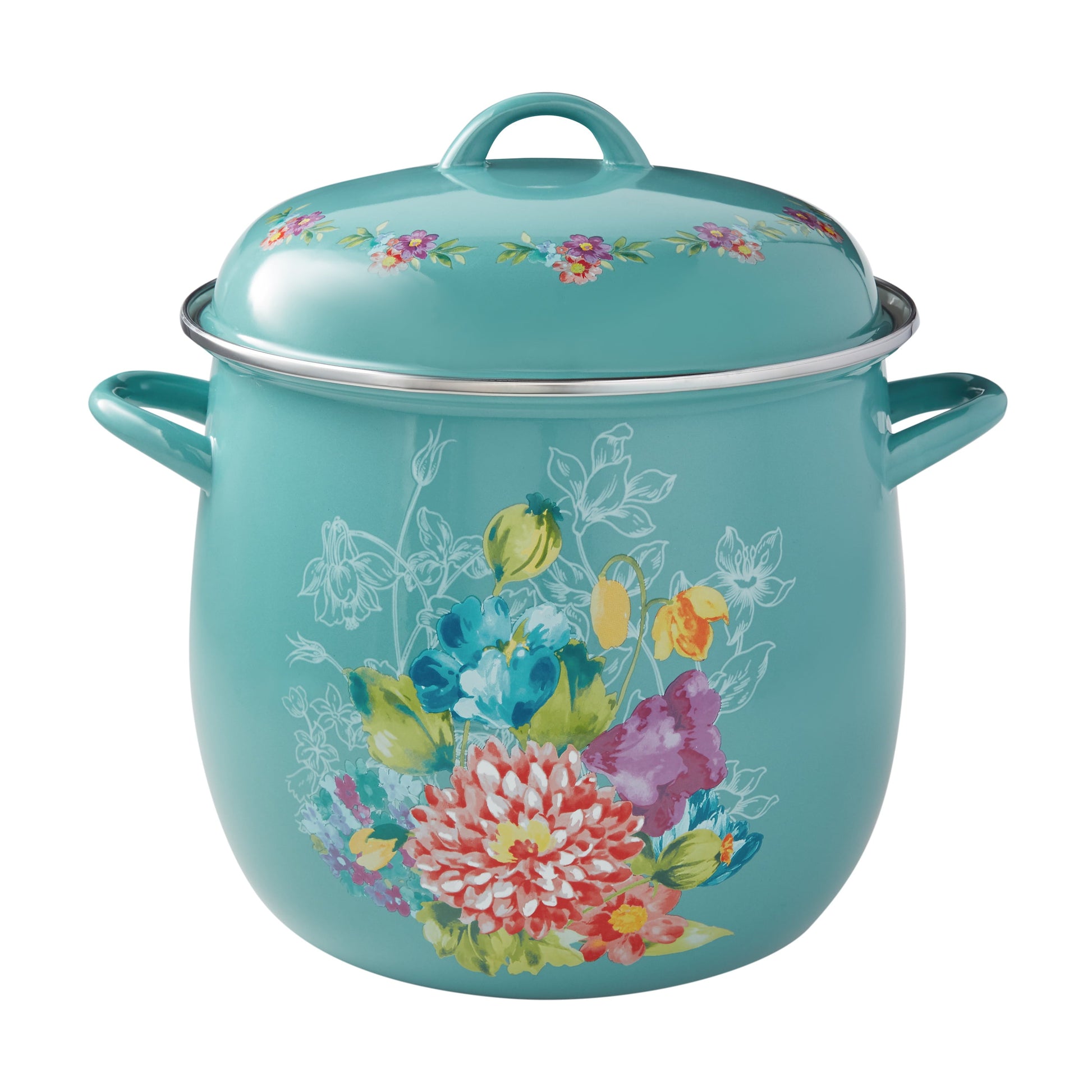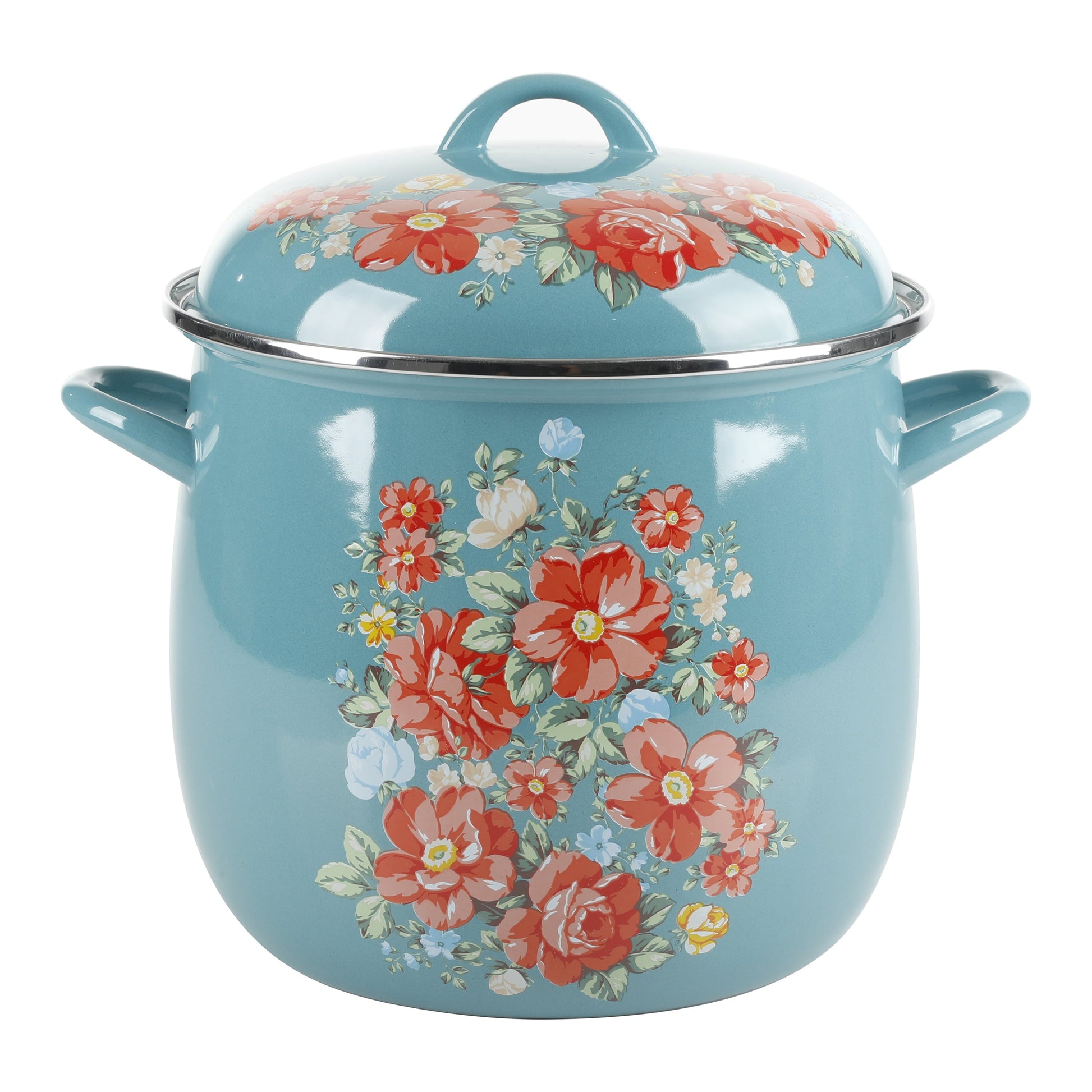 Whip up your favorite stocks, stews, soups, and more in 12-Quart Stock Pot. Stunningly decorated with signature floral designs in vibrant colors and hues, this stock pot makes an attention-grabbing statement on any kitchen counter or dinner table. This country cooking essential serves up delicious results, time after time, with its durable enamel-on-steel construction that resists stains and provides lasting performance and its integrated handles that provide sturdy grips for safer lifting. Perfect for making favorite beef stew or perfect pot roasts, this 12-quart stock pot locks in flavor and yields delicious results. Plus, it's oven-safe, so you can bake and present oven-to-table recipes, too. Fix up your finest meals Enamel-On-Steel 12-Quart Stock Pot*- Breezy Blossom design and Vintage Floral design features Ree's signature floral patterns in eye-catching colors *- Perfect for making a wide variety of dishes *- Durable enamel-on-steel construction offers lasting performance and shine *- Integrated handle holds on both sides allow for safer lifting *- Included lid is decorated to match the base and includes a handle of its own *- Oven-safe and can be used on electric, induction, gas, ceramic, and halogen stovetops *- Use to make a large pot of soup, chicken stock, or boil corn on the cob *-Hand wash only *- Large 12-quart compacity