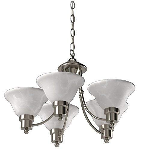 Hardware House's Bristol five-light chandelier features an Art Deco design and is available in a satin nickel finish with alabaster glass (view larger). The Hardware House 54-4452 Bristol five-light chandelier combines the best of contemporary and classic design elements thanks to its Art Deco styling, from its graceful and refined satin nickel hardware to its alabaster glass bulb shades. Measuring 24 inches by 15 inches and intended to complement a variety of décor preferences, it’s the perfect light fixture to install in dining rooms, entryways and foyers, dens, home libraries, and more.Interior IlluminationThe Art Deco-inspired Bristol five-light chandelier melds sophisticated traditional aesthetics with modern flair thanks to its clean lines, gracefully upturned alabaster glass bulb shades, and sleek satin nickel finish. Warmly emitting a soft glow through the slightly frosted glass, this light fixture contributes ambiance to any room in your home, be it a cozy dining nook or elegant front entryway. Housing five 60-watt A19 medium-base bulbs (sold separately), this beautiful chandelier offers the utmost in illumination, perfectly combining form and function. What's in the Box One Hardware House 54-4452 Bristol five-light chandelier in satin nickel finish with alabaster glass bulb shades (five 60-watt A19 medium-base bulbs sold separately).HighlightsFive-light chandelier in satin nickel finish and alabaster glass Utilizes 60-watt A19 medium-base bulbs (not included)Measures 24 inches by 15 inches Backed by a limited 15-year warranty Product Description Beautiful five light fixture with alabaster glass globes. This light uses five (5) 60 watt bulbs **not included**. It has a modern looking satin nickel finish. The estimated measurable size is 24"x15". From the Manufacturer Enhance your decor with this beautiful 24-inch by 15-inch brushed nickel, five light chandelier. The alabaster glass in this chandelier brings a cozy warmth to any room. Five 60-watt bulbs are required. These are not included with the chandelier. This Chandelier installs like the others in the line-up. The Chandelier comes with a bracket to mount into the ceiling box(not included) and is hard wired in.It also has a trim plate that matches the light fixture to cover the ceiling box.