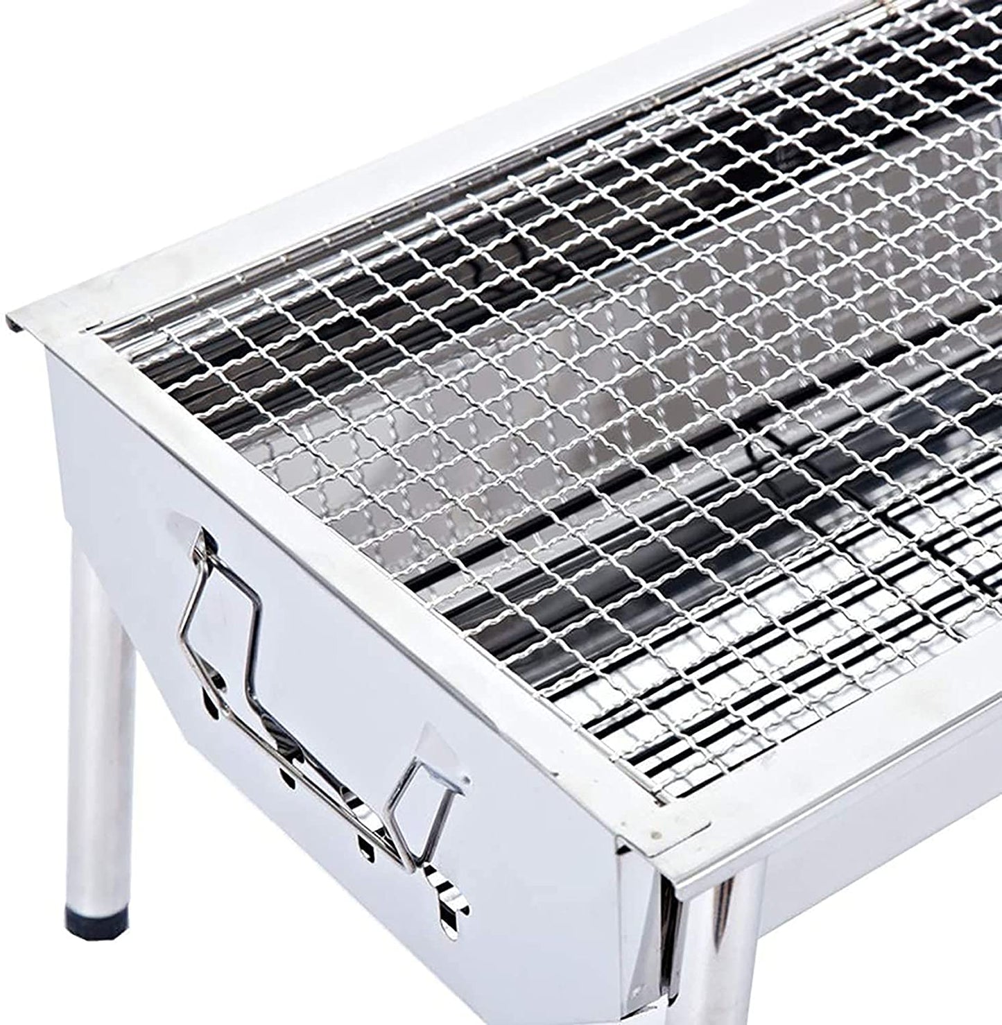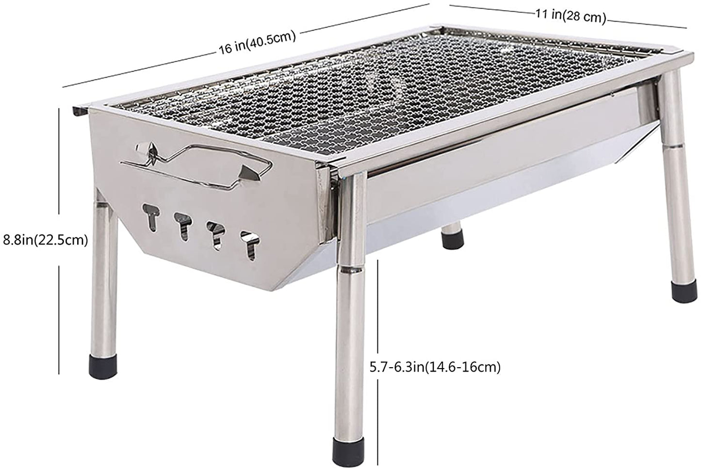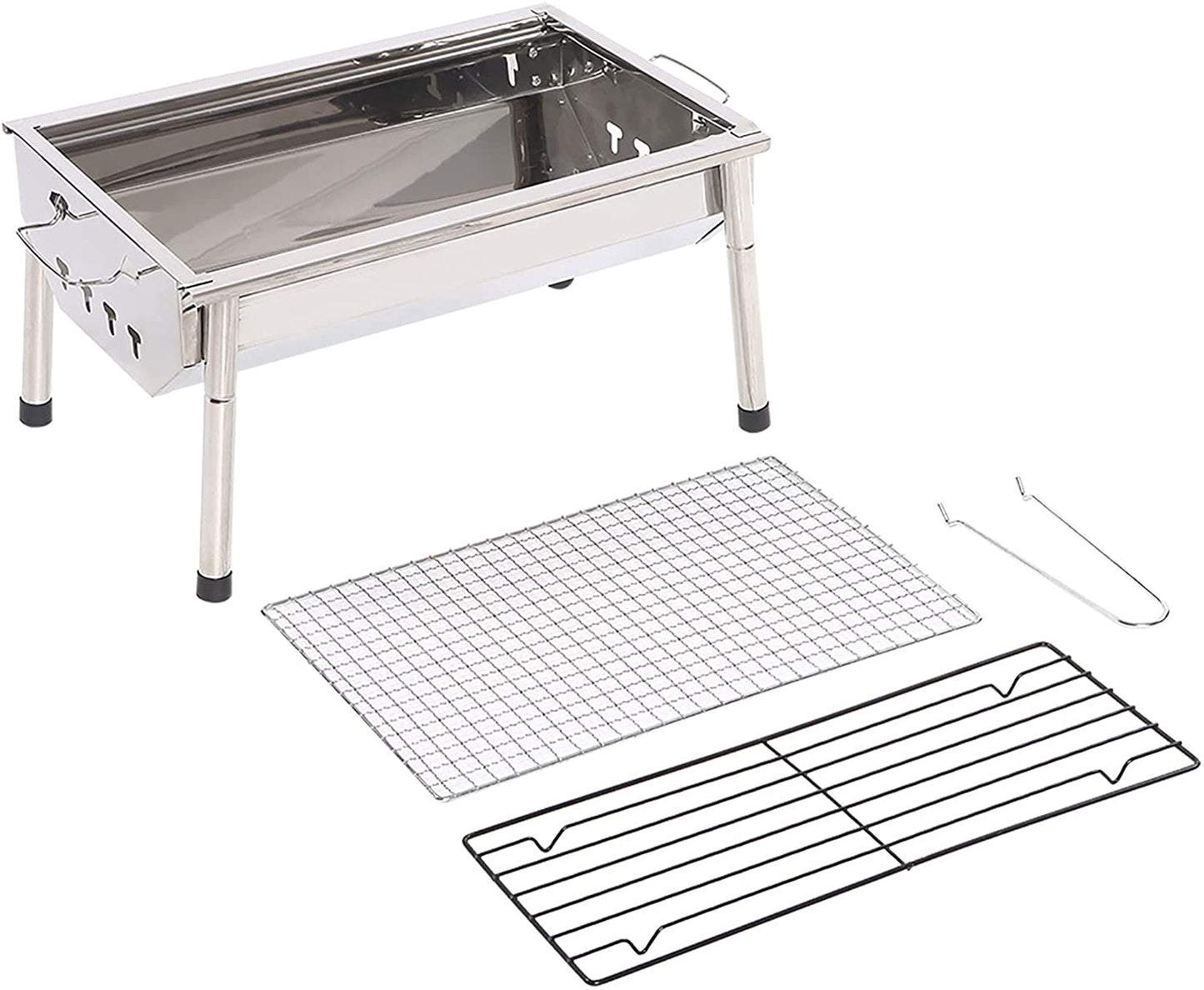 Our BBQ grill set is made with top quality stainless steel and well polish finished, won’t rust and won’t crack like wood handles do, easy to clean and long lasting, which will keep your bbq grill charcoal accessories looking great season after season. Stainless Steel barbecue charcoal grill makes it folded and portable, yet maintain its functionality. Also called a Portable Grill, this stainless steel grill is perfect for camping, backpacking, picnics, parties, trailers, parks, etc. Start a joyful BBQ on the go and enjoy the delicious Shish Kebab, Lamb Kebab, Japanese Yakitori, Malaysian Satay, etc. Bring this outdoor grills & smokers to the park or use it as Camping Grill. Double air vents and ash catcher Double air vents on both ends for temperature control and create air circulation throughout the charcoal grill, which speeds up the burning. Built-in grid charcoal frame ash catcher provides hassle-free ash clean up. Air Ventilation Features easy to adjust vent that controls heat intensity and create even air circulation throughout the barbecue grill, bringing a better cooking taste to your favorite meals. Convenient handles Convenient handles for portability and grilling on the go - perfect for camping. The BBQ grill has four detachable legs, Detachable legs design made for easy carry and storage . Perfect for camping, backpacking, picnics, tailgate parties, camping, trailers, parks, and grilling in small spaces. Our Charcoal Grill reference many sellers' critical reviews and buyers' good points. Some of the places where we went camping were uneven, and we had to adjust the height of the barbecue leg. Our company's designers set up screw button with adjustable height. The legs of the barbeque grill can be folded so it can be so convenient if you want a perfect BBQ camping trip. Whenever and wherever, it's up to you. Description: Material: Stainless Steel Color: Sliver Item Dimensions LxWxH: 15.9 x 11 x 8.8 inches Finish Type: Stainless Steel