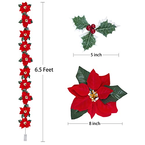 6.5 Feet Pre-Lit Velvet Artificial Poinsettia Christmas Garland with Lights & Red Berries Christmas Decor