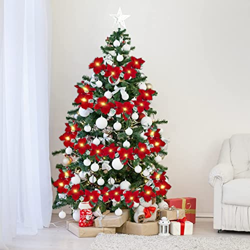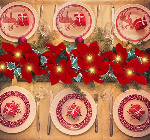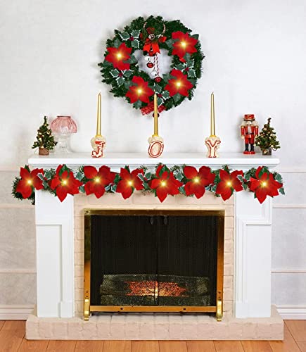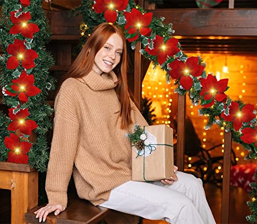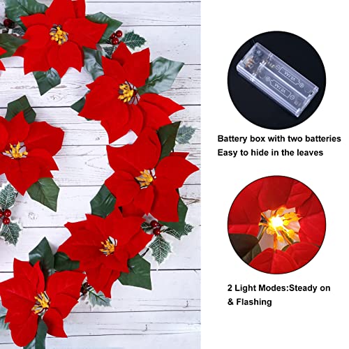 - The Appearance is Exquisite: Each polyester fiber Christmas garland with lights is interspersed with light green holly leaves, and a pinch of pearly red berries between the flowers, and the center of the poinsettia Christmas decorations garland is inlaid with an LED bulb.