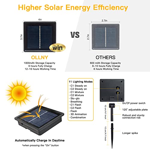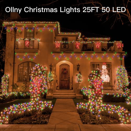 - Super Bright Christmas Lights - 50 LED blubs feature in 25ft long string, which emits a multicolored(including warm white) glow to create a fantastic and romantic atmosphere for you. Plus, Ollny solar fairy lights come with in-built 1000mAh high capacity batteries, can continuously light up for 8-12 hours after fully charged.