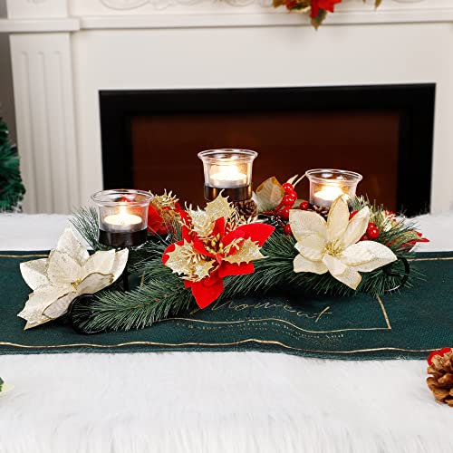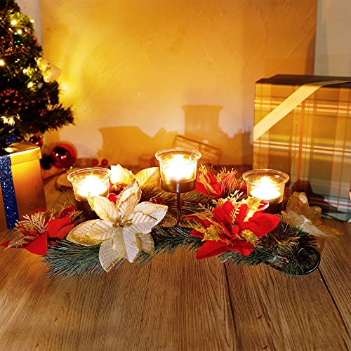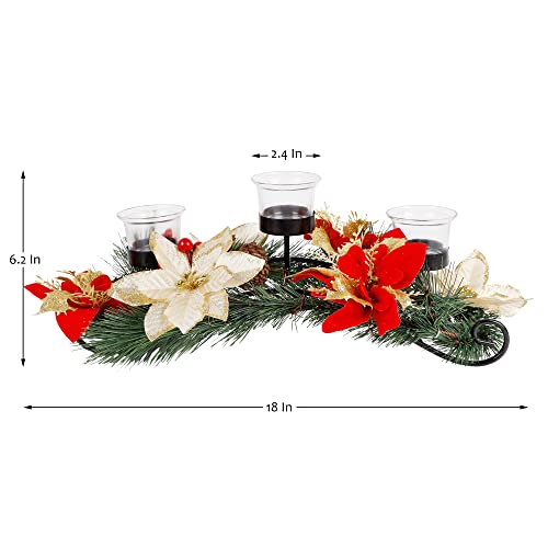 - Christmas Table Centerpiece: This Christmas candle holder are trimmed with red and golden poinsettia flowers, red berry branches, pine cones, three steel plates and 3 glass holders. It will be a perfect table decoration for Christmas.