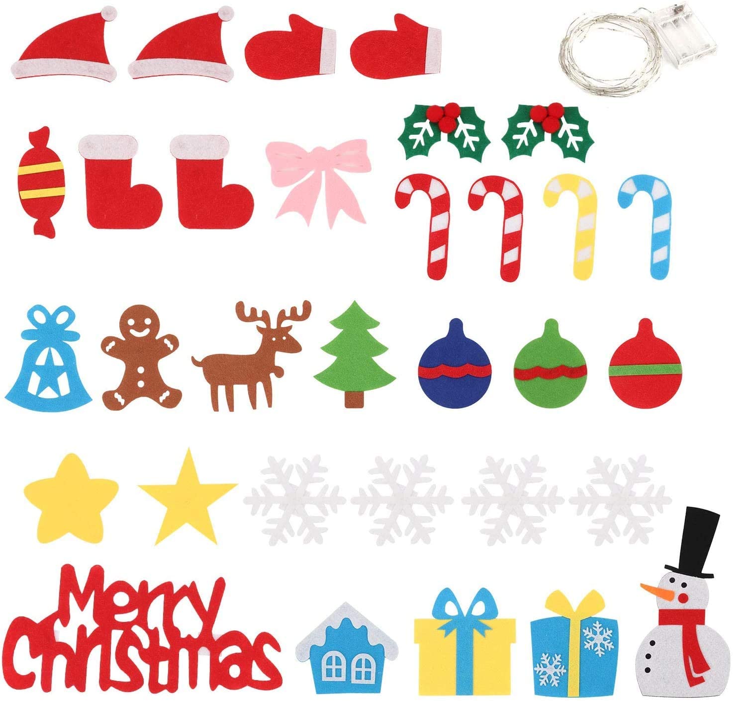 Felt Christmas Tree Set Creative DIY Christmas Tree with Ornaments for Kids Perfect Christmas Gift - The DIY Xmas tree can help to improve children’s understanding of graphics capabilities and inspire their hand-eye coordination. The package contains a Felt Christmas tree, 32 cute accessories, and a LED string of about 5 meters. Boost friendship with your kids, DIY could enhance the relationship between you and your kids. Felt tree with 32 cute accessories, such as Christmas hat, elk, snowflake, candy, gift box, snowman Wait a minute; the package also has an LED string light. *- UPGRADE: You can attach the accessory to any part of the Christmas tree. No longer limited to specific places. The Felt Christmas Tree is made of 3mm thick quality felt material, No odor, no harm to children. *- DETAILS OF FELT CHRISTMAS TREE: the Hight of Christmas tree is about 98cm (38.58inch) , about 70cm (27.55inch) at the widest point. With 32 cute accessories, such as Christmas hat, elk, snowflake, candy, gift box, Snowman Wait a minute; the package also has an LED string light. *- HIGHLIGHTS: The DIY Xmas tree can help to improve children?s understanding of graphics capabilities and inspire their hand-eye coordination. *- BEST CHRISTMAS GIFT: Boost friendship with your kids, DIY could enhance the relationship between you and your kids. *- The package contains a Felt Christmas tree, 32 cute accessories, and a LED string of about 5 meters. Without battery.