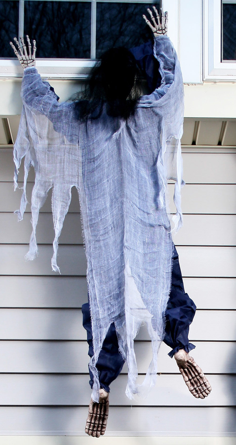 Make the candy-seeking kids think you have real zombies in your lawn when you hang this decorative ornament outside your home. It features detailing to make as life-like as possible. The limbs are posable so you can get the desired pose and aesthetic. Fake materials means you can store it away for the season with ease. Foam, metal, paper, polyethylene, and polypropylene. Approx. 63"L with a 45" arm span. *- Add a truly, lively, and stylish decoration to your outdoor décor elements with this zombie decoration. It has mounting points and can be posed to the desired effect. *- Head, hands & feet are molded styrofoam for an aesthetic that is almost life-like from a distance. Head has glued-on synthetic hair & the body is draped with cheesecloth robe. *- Wire limbs can be posed as desired to achieve the most eye-catching aesthetic. Hang it on railing of the porch, anchor points around the home exterior, or from a tree and branches. *- Keep this hanging zombie decoration for outdoors in your own home or give it as a Halloween holiday gift to those family and friends who like to add a spooky design element. *- Foam, metal, paper, polyethylene, and polypropylene. Approx. 63"L with a 45" arm span.