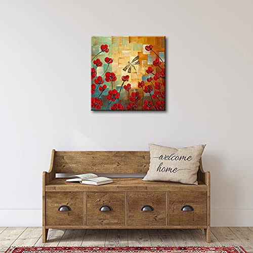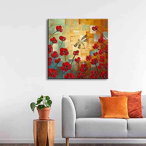 - Gallery wrapped red flowers canvas oil paintings wall art set ready to hang for home decorations wall decor, each panel has a black hook already mounted on the wooden bar for easy hanging out of box.