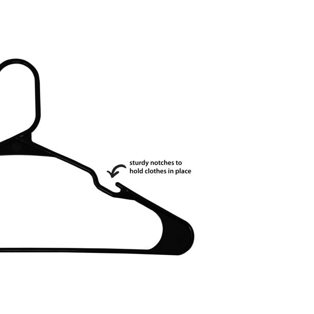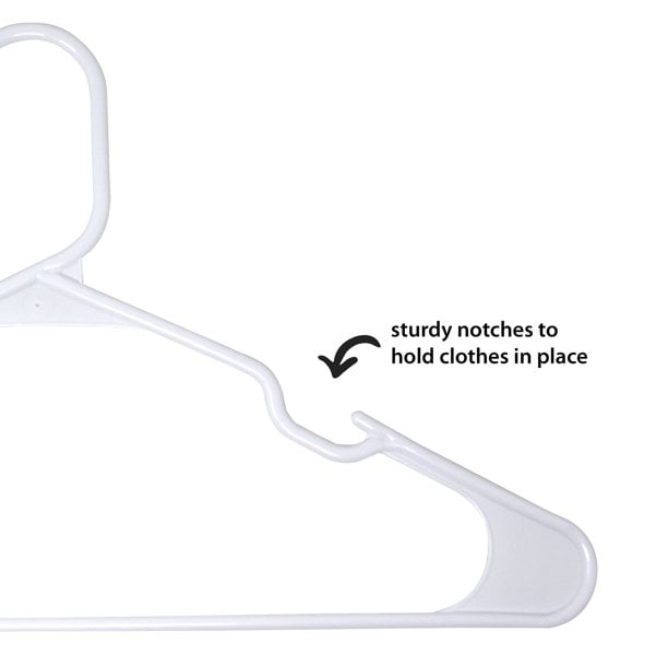 Plastic Hangers feature a super slim design to help you maximize your closet space while making it tidy and organized. The sturdy and durable hanger organizers are guaranteed to stand repeated use! The reinforced plastic edges add stability and support. With the plastics smooth edges, you never have to worry about clothing becoming snagged. The hangers works well with adult, teen and children's clothes. The nonslip hangers work well with ties, belts, shawls, thin strap shirts, tanks and women undergarments such as bras, nightgowns, and camisoles.