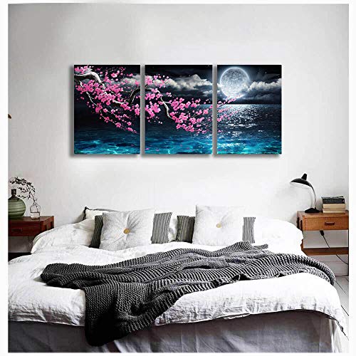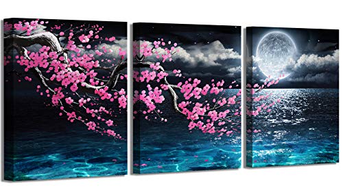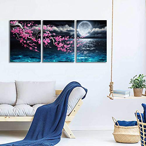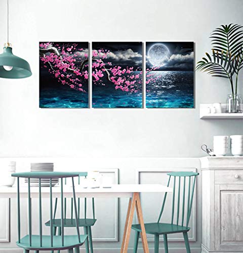 Framed 3 Pieces Plum Blossom Moon Ocean Wall Canvas Art Size 12x16 Each Panel
