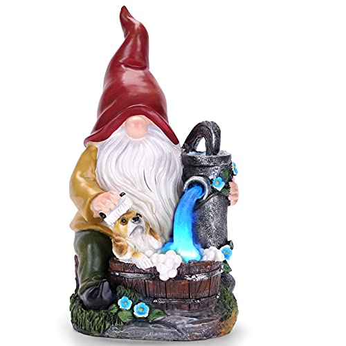 - GNOMES GARDEN KIT: From garden sculptures, an adorable garden gnome is pumping water into a barrel to bathe his dog, includes details like soap bubbles, brush/towel, flowers, etc. At dusk, the water will automatically glow with blue light. Place it where you want it to, and it will keep working for you every day.