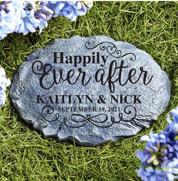 SWEET GARDEN ACCENT: What a beautiful way to commemorate the day they said, “I do." “Happily ever after" will appear on each stepping stone.