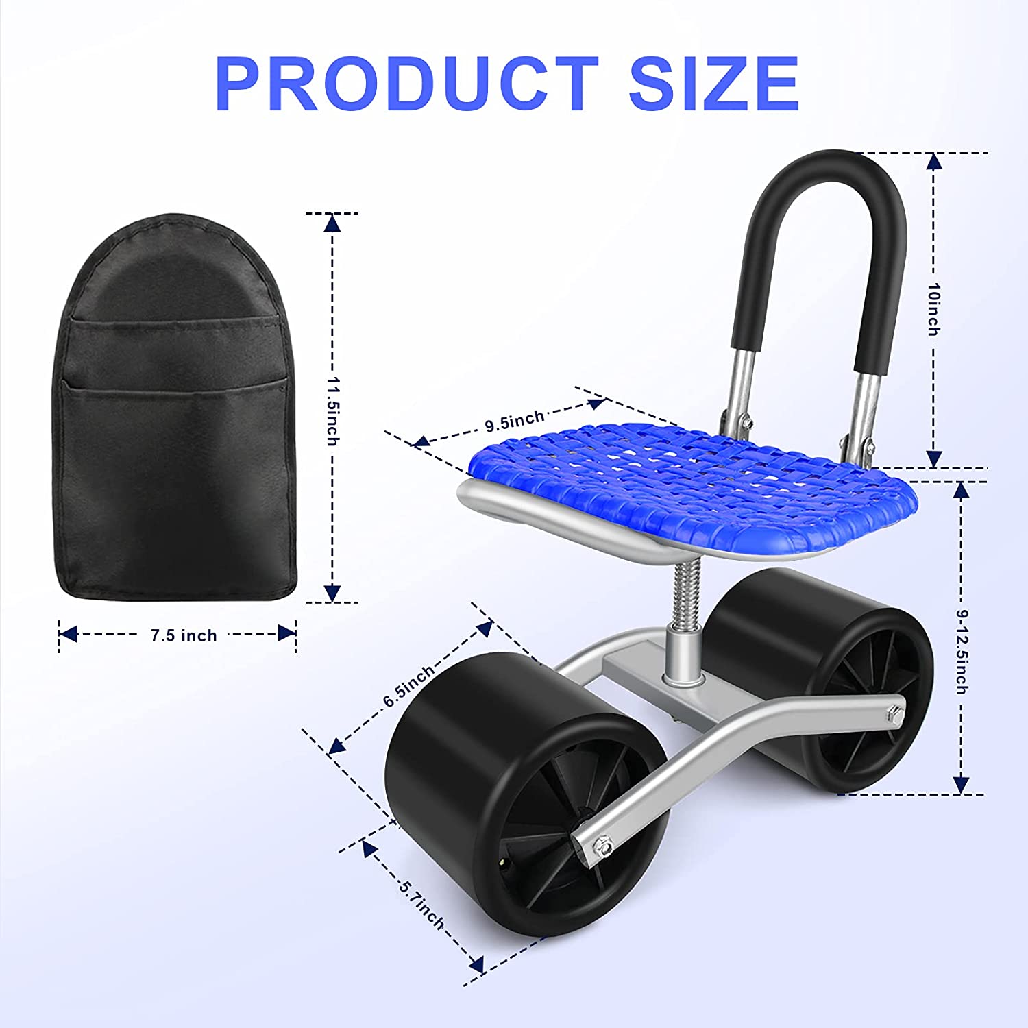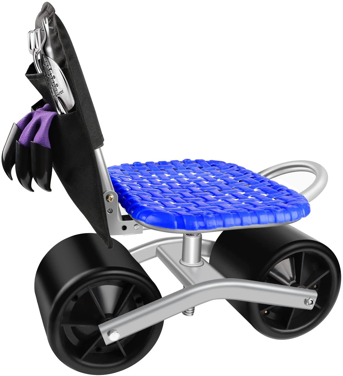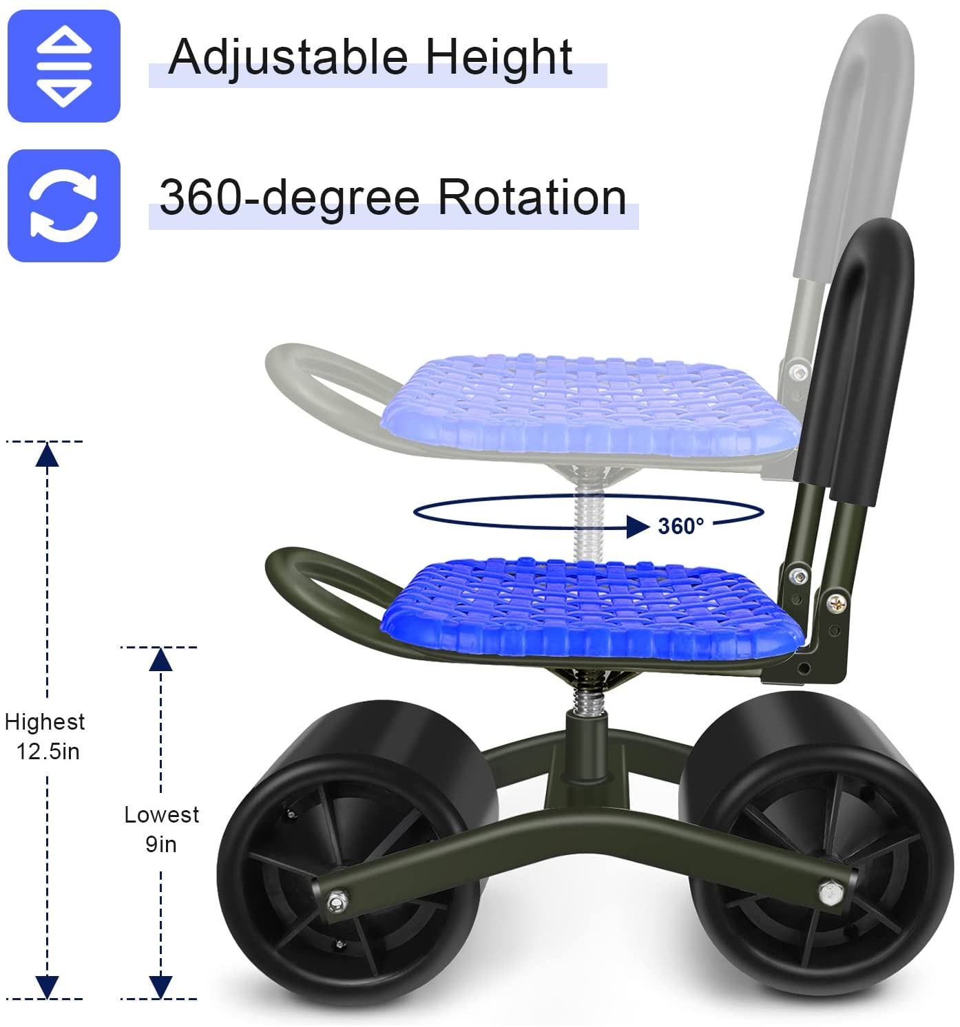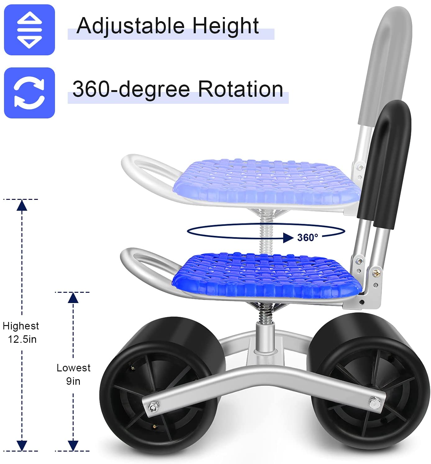 Upgraded anti-rust coated to protect the metal parts against rusting. *- Go with a free tool bag with two big pockets to place your lawn care equipment handy. *- Work as a garden cart with rotatable seat, it can save your knee and back. Seat height is adjustable from 9inch to 12.5inch. *- 360 Degree rotatable chair makes your weeding and gardening much easier. Garden stool chair with wheels rolling around provides the ultimate protection to your lawn.