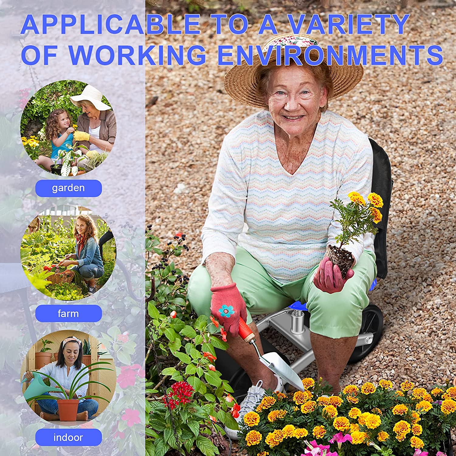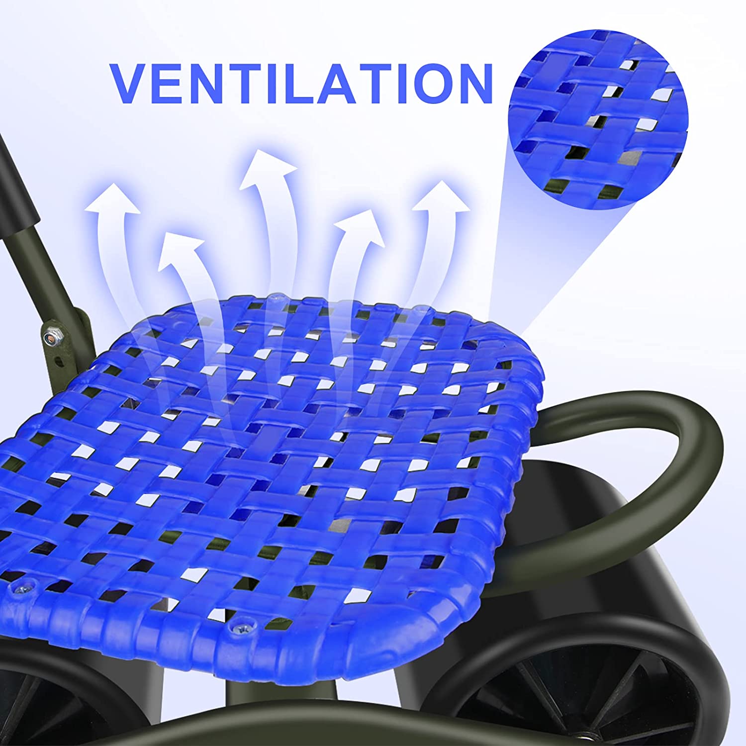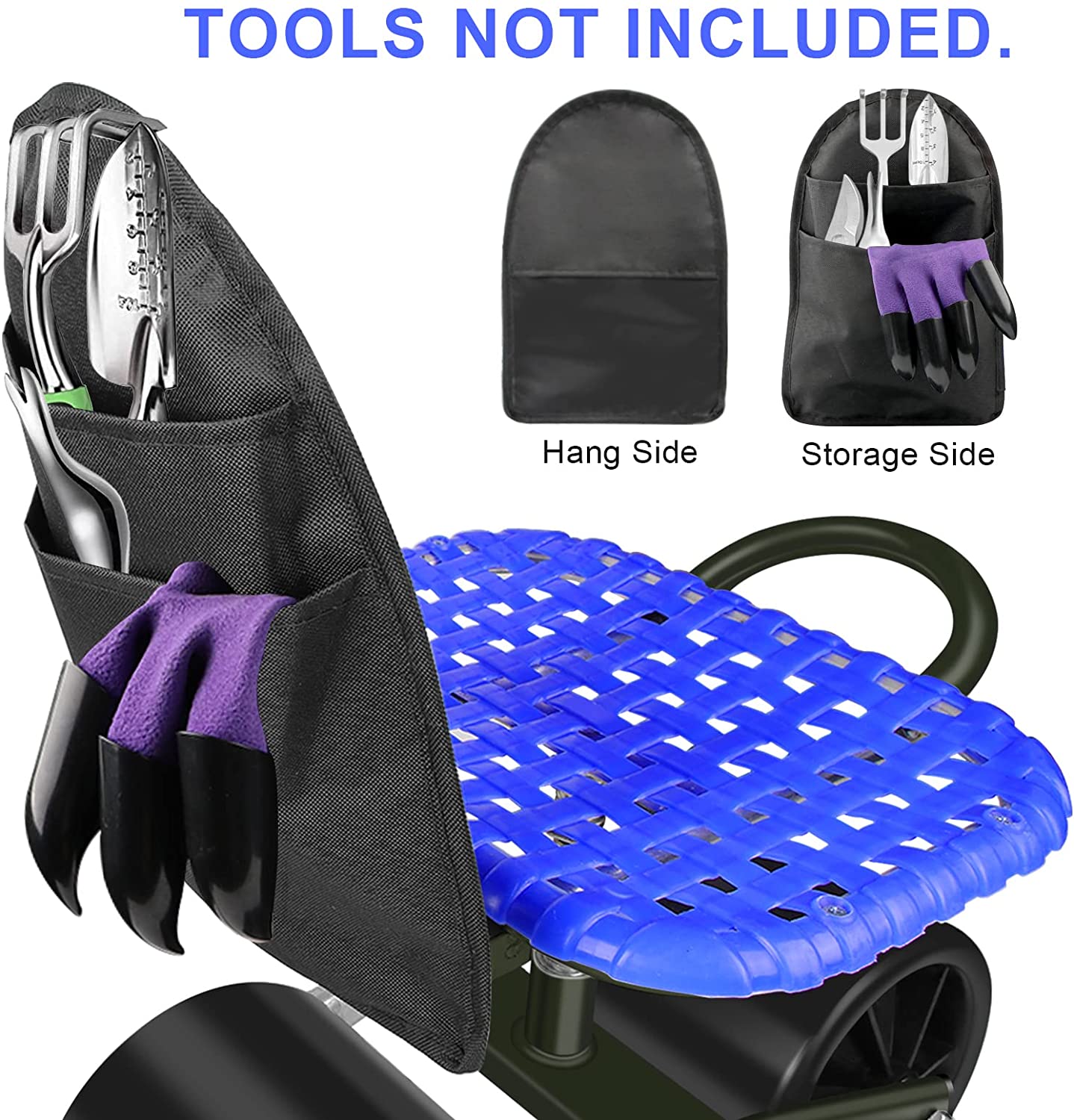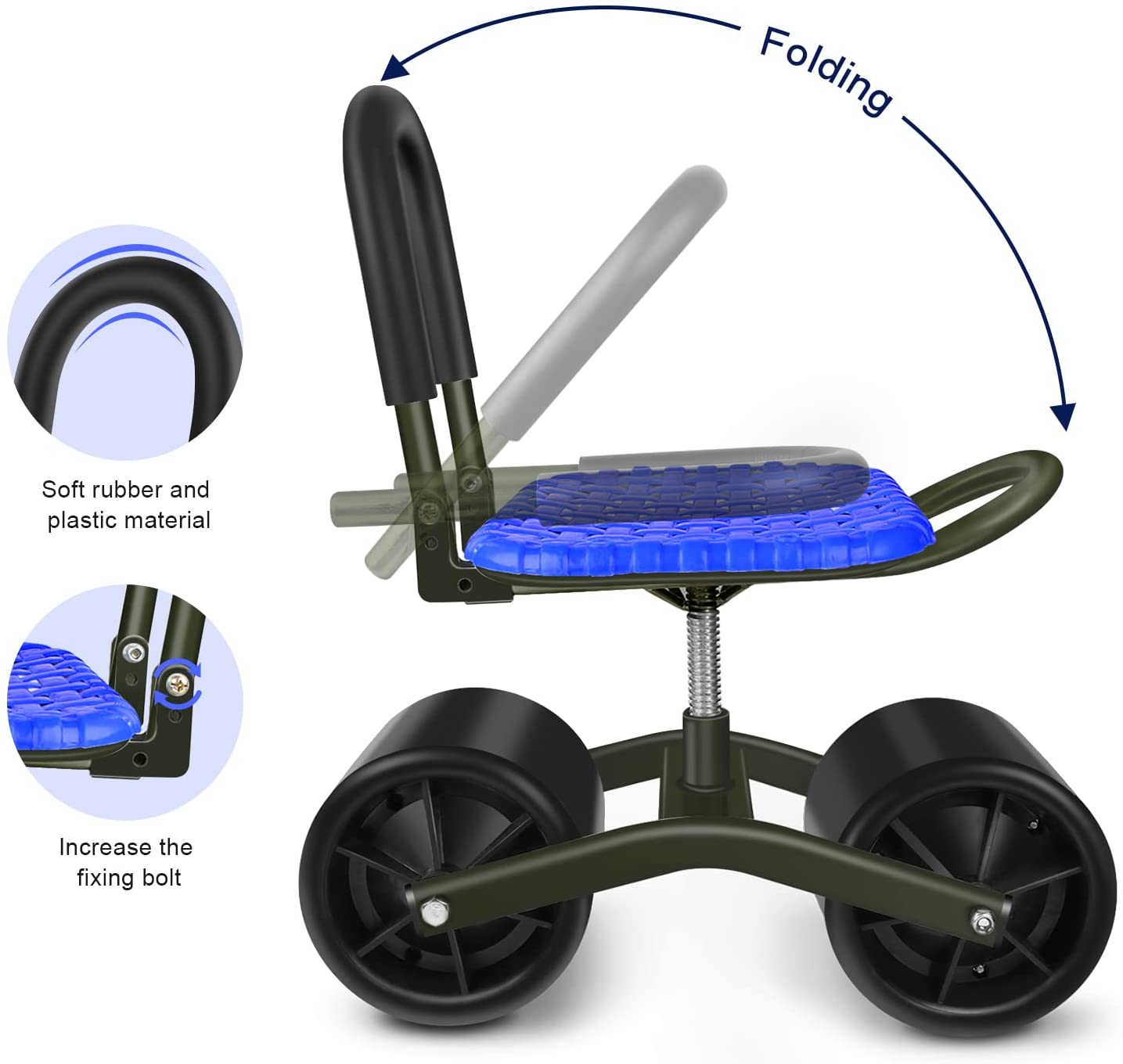 Upgraded anti-rust coated to protect the metal parts against rusting. *- Go with a free tool bag with two big pockets to place your lawn care equipment handy. *- Work as a garden cart with rotatable seat, it can save your knee and back. Seat height is adjustable from 9inch to 12.5inch. *- 360 Degree rotatable chair makes your weeding and gardening much easier. Garden stool chair with wheels rolling around provides the ultimate protection to your lawn.